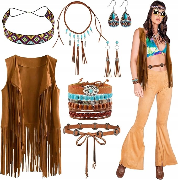 - Наряд в стиле хиппи 70-х годов: вы получите 1 жилет в стиле хиппи, 1 цепочку с кисточками, 1 пару сережек с кисточками, 1 повязку на голову в стиле бохо, 1 пару сережек-подвесок, 1 цепочку на талию и 1 браслет в стиле бохо. Превратите себя в свободный дух бохо с нашими нарядами хиппи 60-х и 70-х годов.
