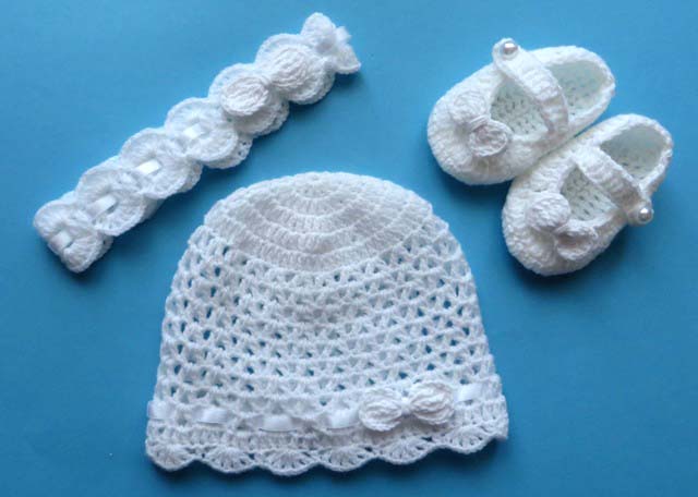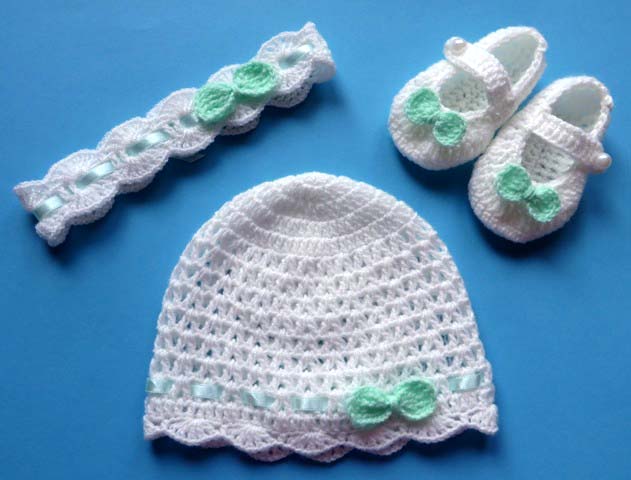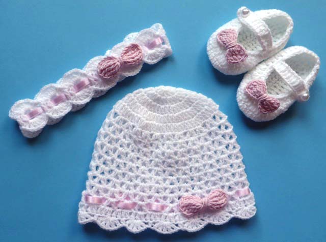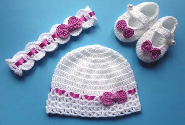 Комплект связан крючком из трех частей: шапка+туфли+повязка на голову, может быть выполнен в любом цвете пряжи и фурнитуры.