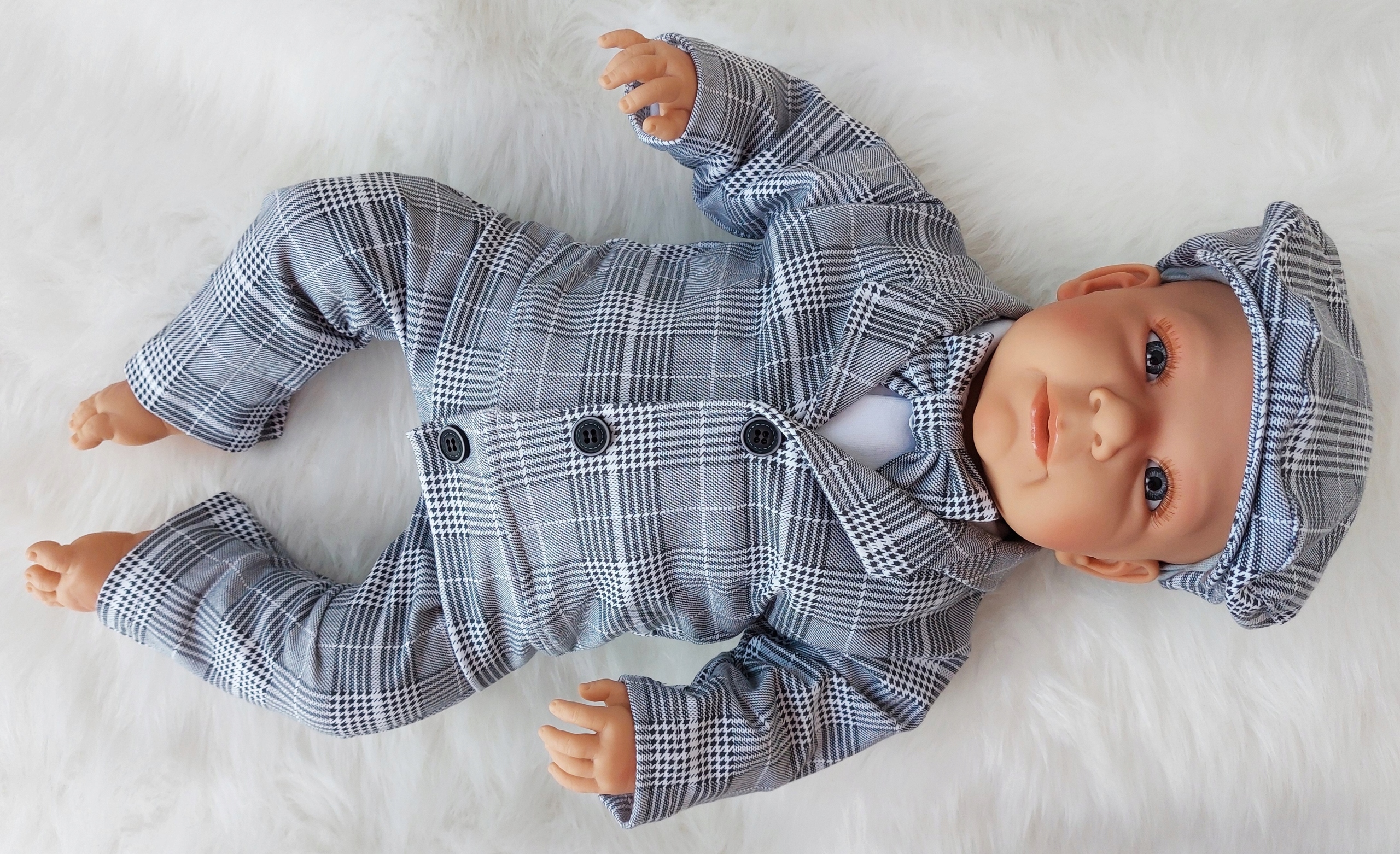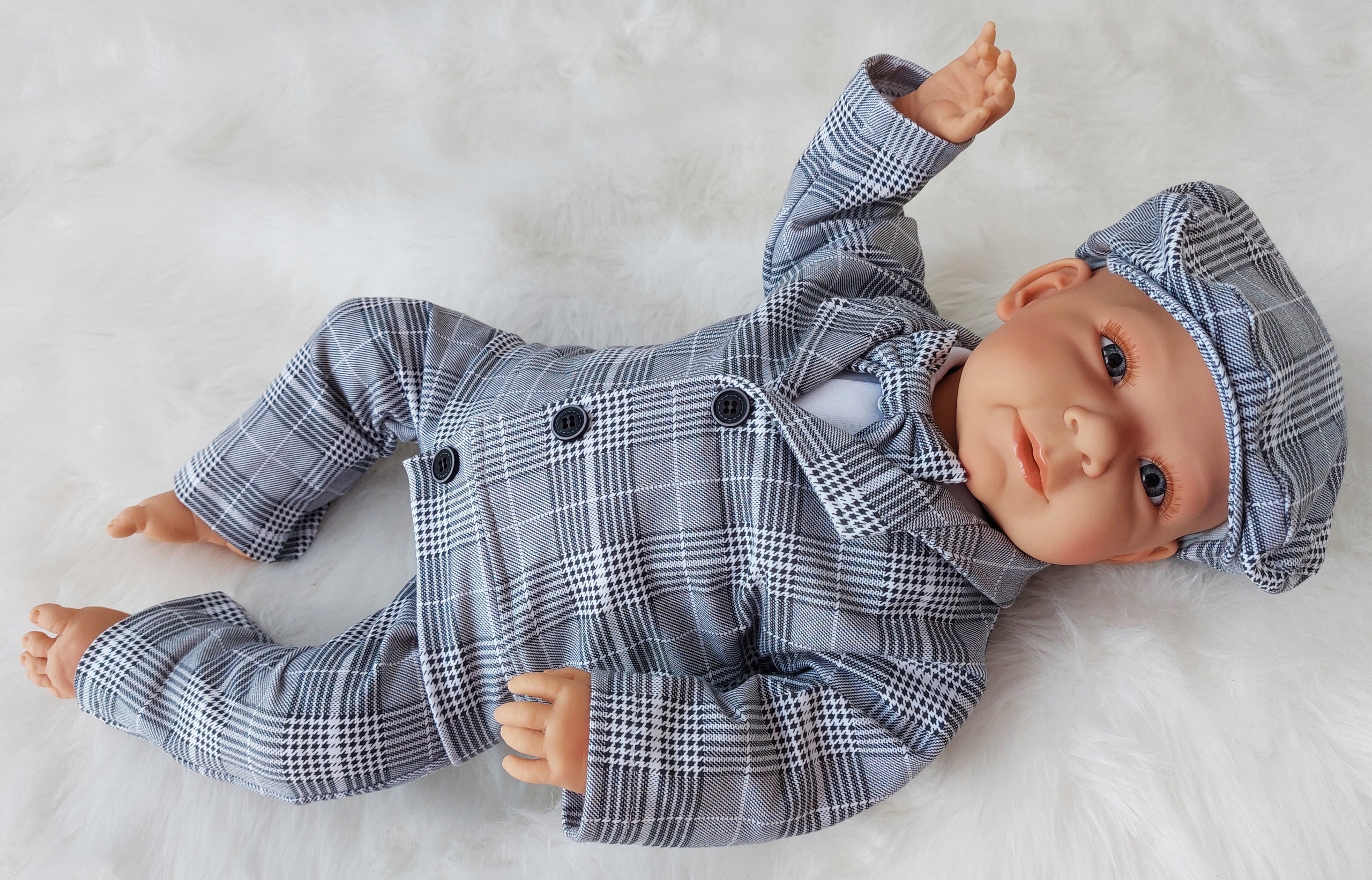 - брюки - из серой клетчатой ткани, хлопок (95% хлопок, 5% эластан) ), на эластичном поясе, украшенном пуговицами