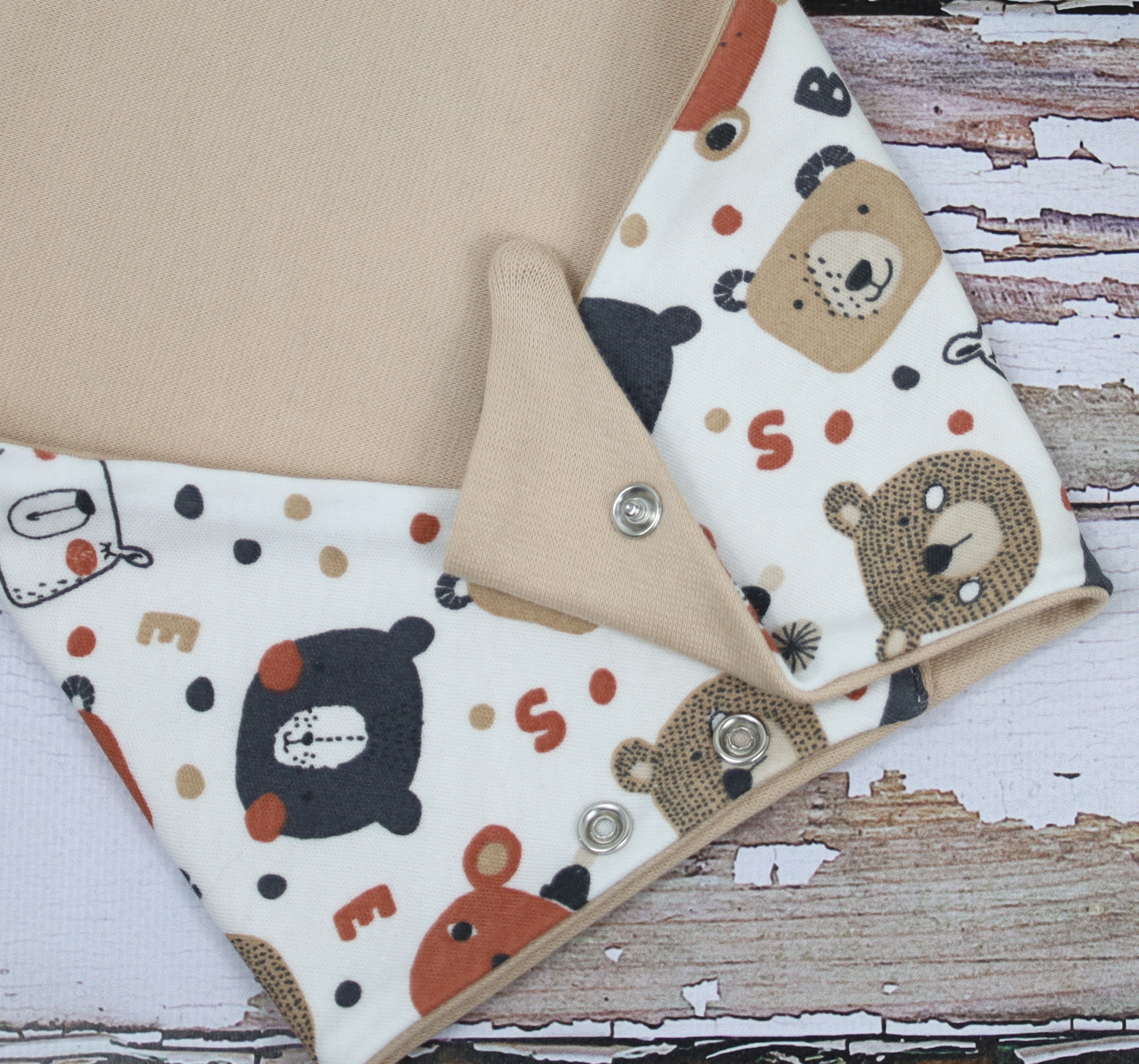 - двухслойный шарф - одна сторона гладкая бежевого цвета, другая с принтом плюшевого мишки
