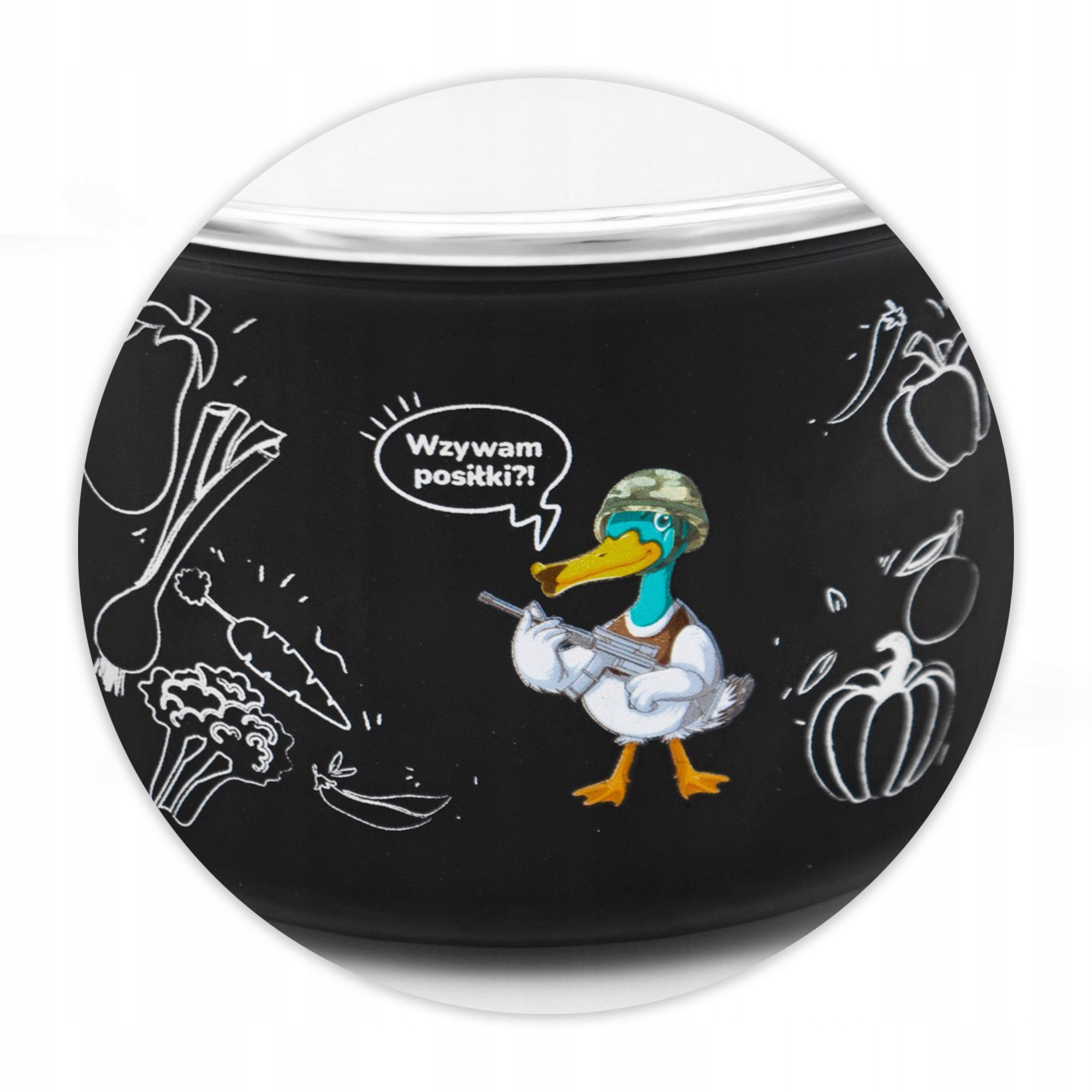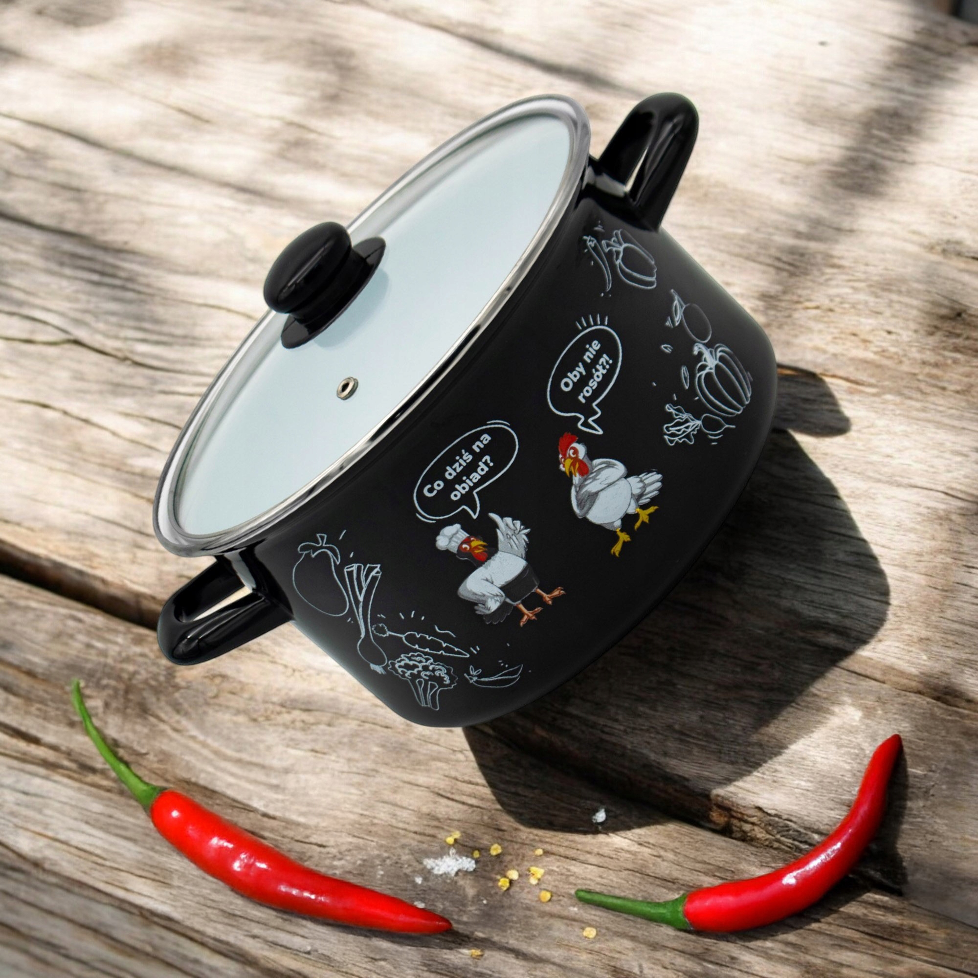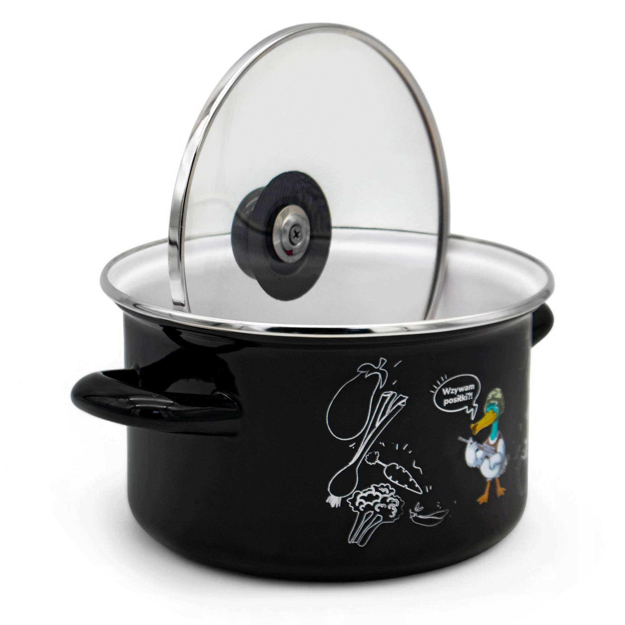 Набор эмалированных горшков отличается интересным, современным и юмористическим рисунком, который представляет кухню немного радости и свежести. Творческие мотивы делают горшки не только функциональными, но и являются интересным декоративным элементом. Такой дизайн, безусловно, будет персонажем любой кухни, что делает приготовление пищи еще более приятной.