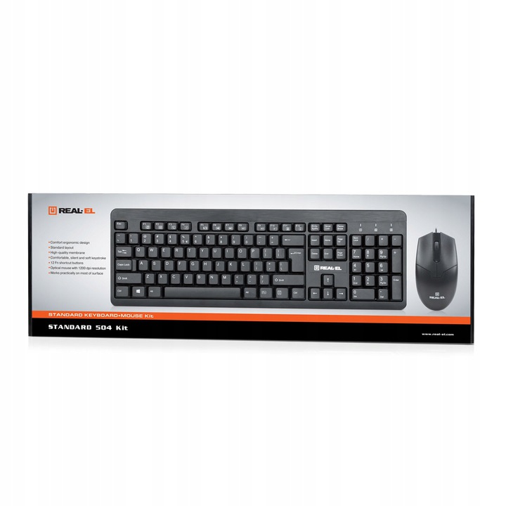 Эргономичный дизайн, стандартная раскладка, качественная мембрана, интерфейс USB, удобство, оптическая мышь с разрешением 1200 dpi, тихие и четкие нажатия клавиш – особенности стандартного набора клавиатура + мышь REAL-EL Standard 504 Kit EN .