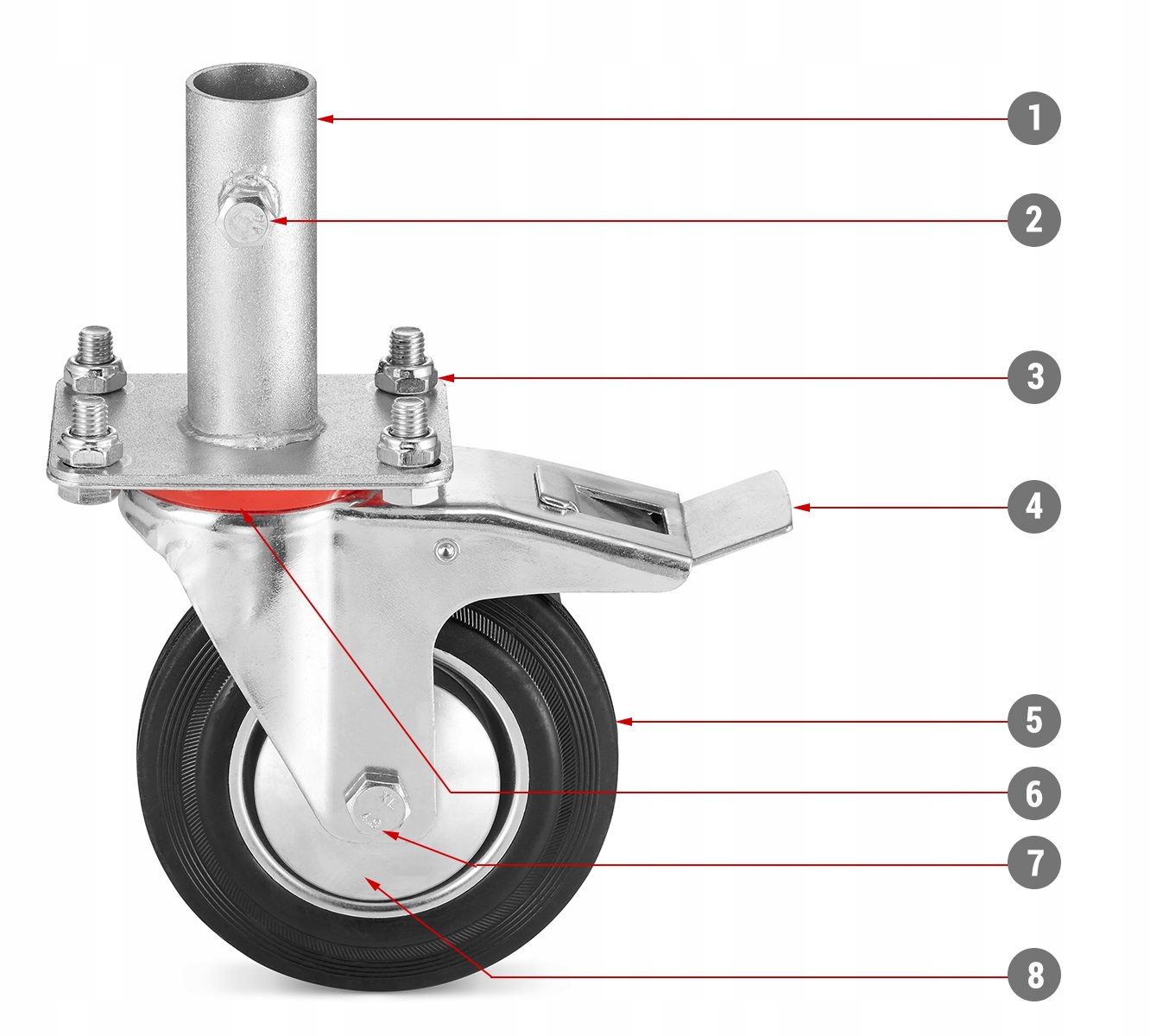 Наш комплект состоит из 4 колес с тормозом - в отличие от конкурентов, предлагающих 2 колеса с тормозом + 2 колеса без тормоза. Помните, что только блокировка каждого колеса гарантирует безопасность и то, что леса не «поедут». Решите для себя, стоит ли инвестировать немного больше, чтобы иметь надежное и безопасное решение.