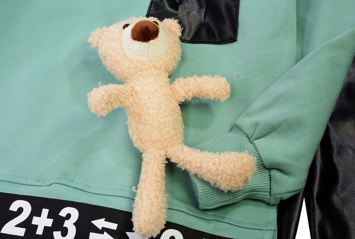 - БЛУЗКА потолще /как толстовка/, длинная спинка, тесьма с принтом и карманом. перед, в котором можно спрятать мишку ;-)