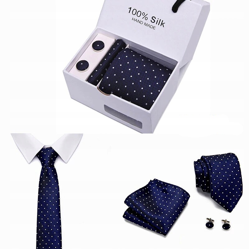 Элегантный комплект для каждого мужчины, состоящий из галстука, запонок и нагрудного платка. Все упаковано в элегантную коробку, идеальную для подарка.