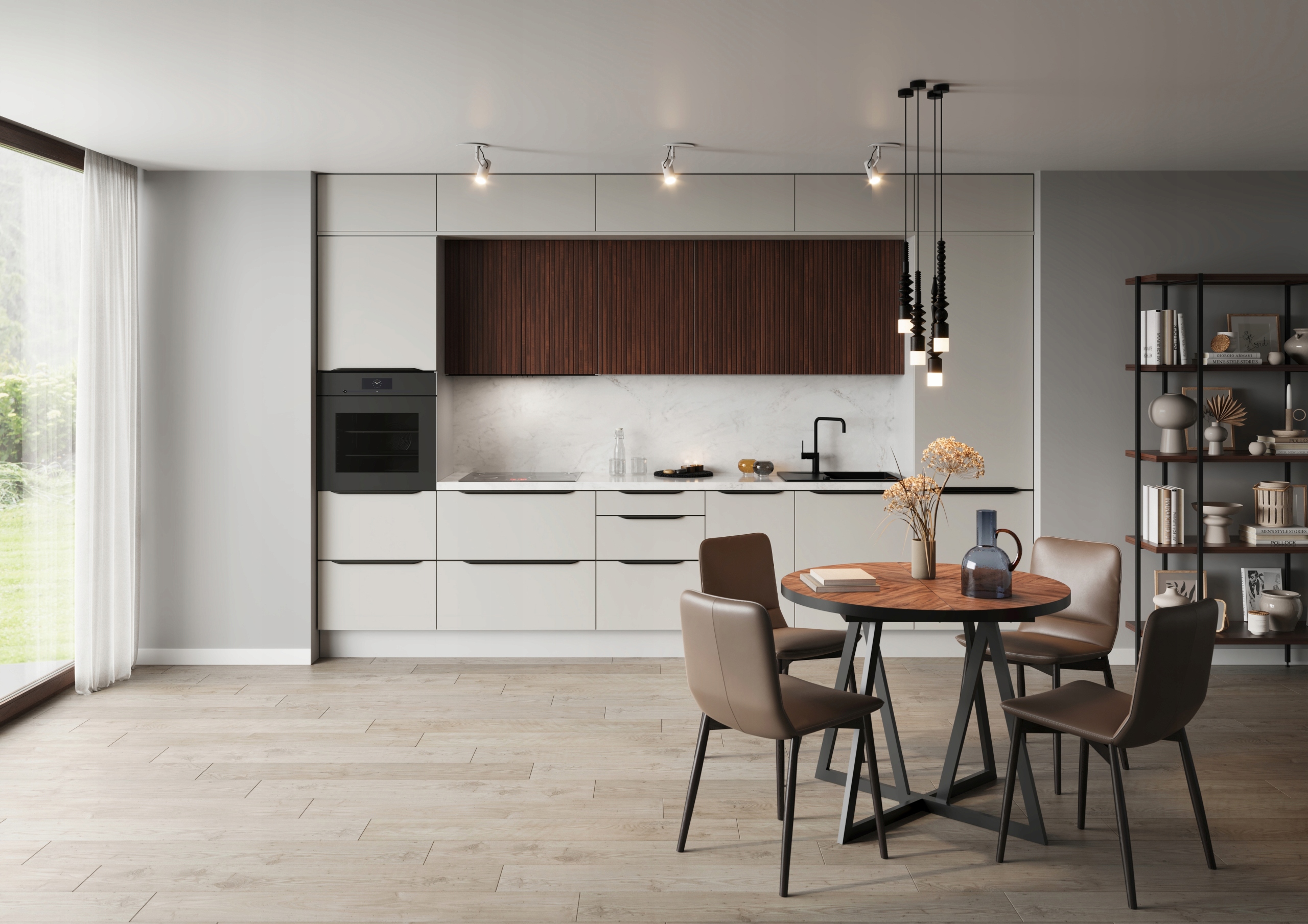 Фронты OS2 ламинированные с рамочной конструкцией, толщина 18 мм, передние края обработаны кромкой ABS толщиной 1 мм в цвет фасада, боковые ручки, алюминий, черные, интегрированы с фасадом< /п>