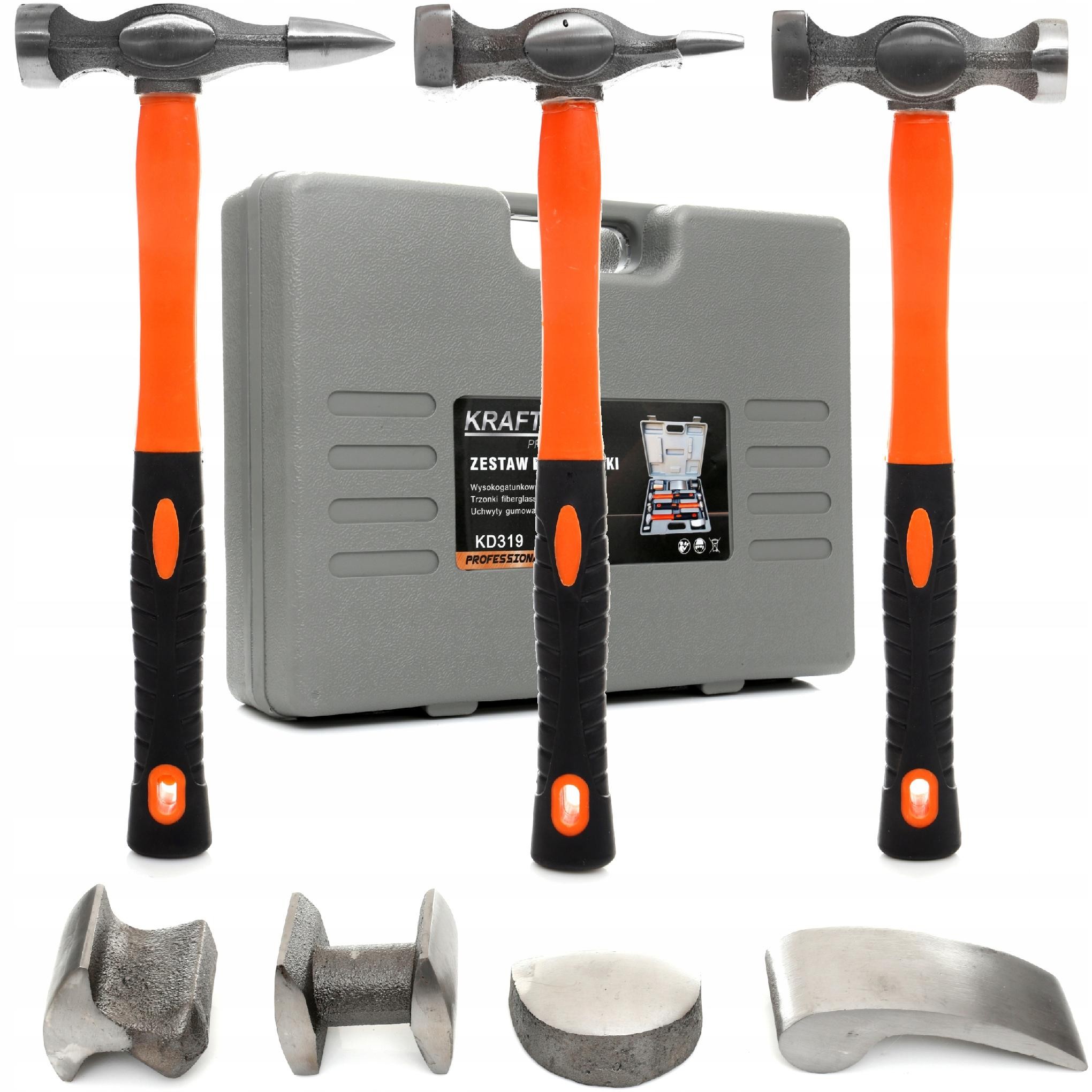 В набор для обработки листового металла с символом KD319 от Kraft&Dele входят 4 наковальни (выпуклая, крюковая, дуговая и универсальная), а также 3 молотка с характерными рабочими поверхностями и профилированной ручкой из стекловолокна. (дополнительно покрыт резиновым покрытием).