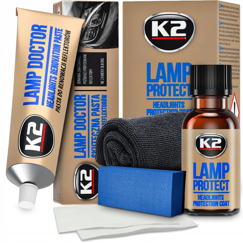 | ПОЛИРОВАЛЬНАЯ ПАСТА K2 LAMP DOCTOR 60G | K2 ЗАЩИТНОЕ ПОКРЫТИЕ 10 МЛ | АППЛИКАТОР | 2X САЛФЕТКИ-АППЛИКАТОРЫ | МИКРОФИБРА 30X30 |