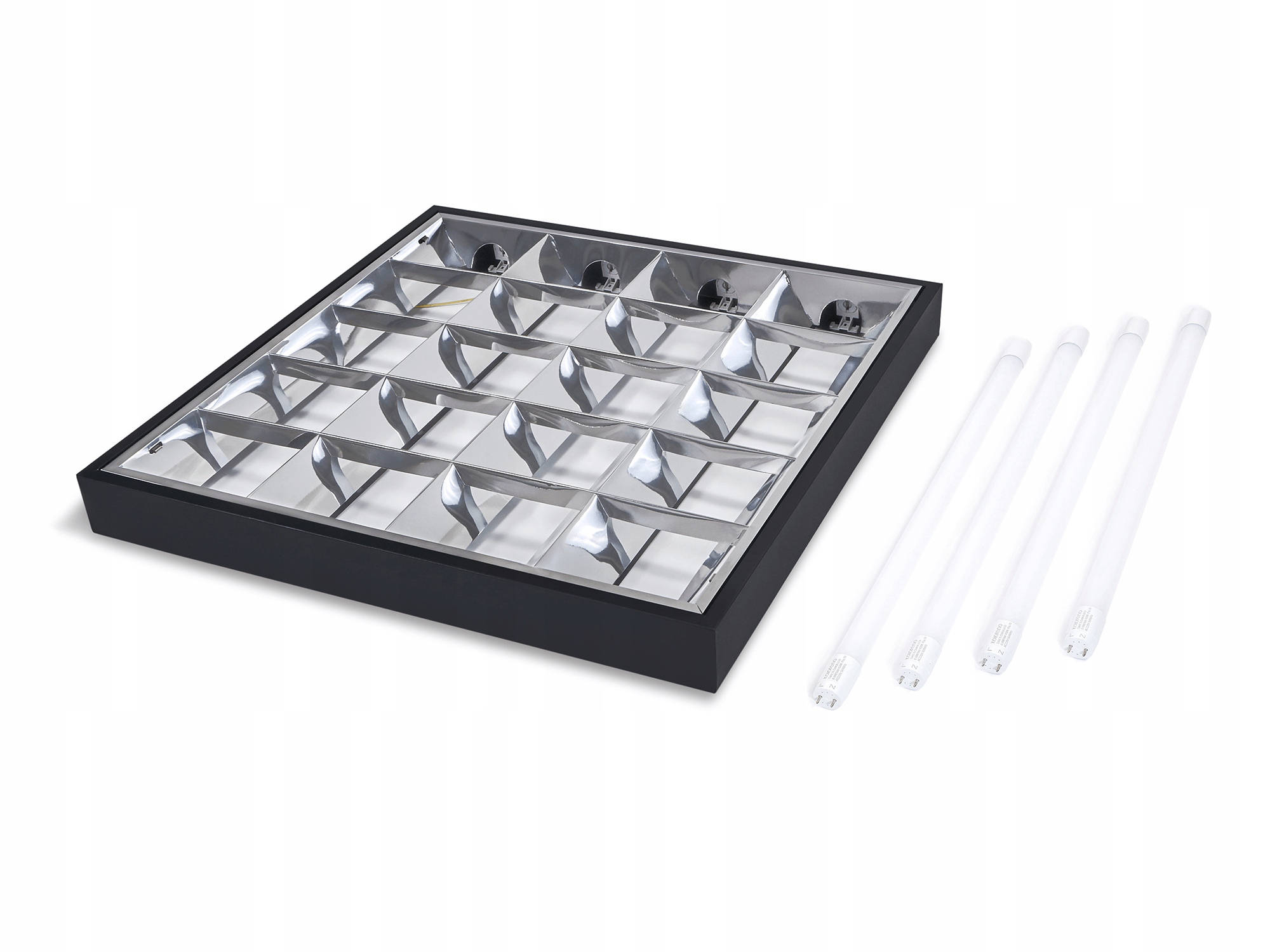 Комплект: 1 накладной черный решетчатый светильник 4x60 см + 4 светодиодные люминесцентные лампы мощностью 9 Вт, нейтральный белый (4500K)