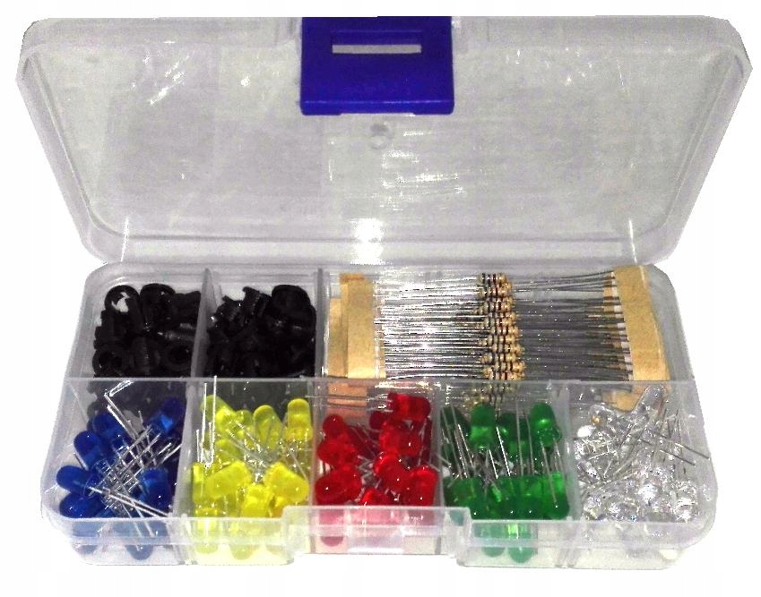 Набор 100 шт. Светодиоды диаметром 5 мм пяти цветов: синий, зеленый, желтый, белый и красный.