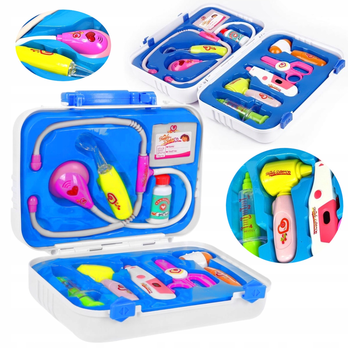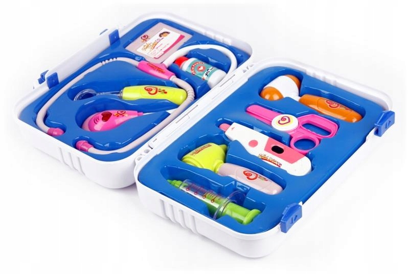 В набор входит 9 аксессуаров прямо из врачебного чемоданчика. : стетоскоп, шприц, термометр, молоток, искусственные лекарства, устройство для проверки слуха, устройство для проверки горла, ножницы и визитная карточка.