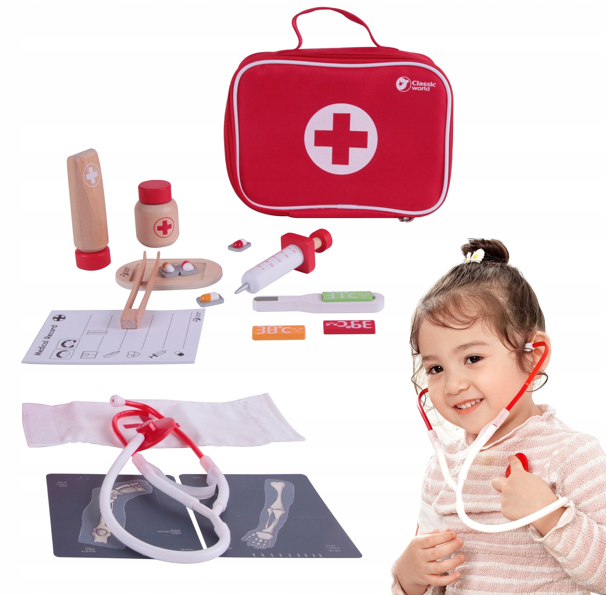 Набор Classic World содержит все, что нужно вашему маленькому Доктору, чтобы играть в доктора. Будущие врачи и медсестры смогут слушать сердцебиение пациентов (мишек, кукол) с помощью стетоскопа, «измерять» им температуру термометром, «делать» уколы или вводить необходимые лекарства. Игра в Доктора — это не только ролевая игра, это еще и обучение сочувствию и состраданию, что очень важно в социальных отношениях. Поддерживает развитие воображения и обучает решению задач.