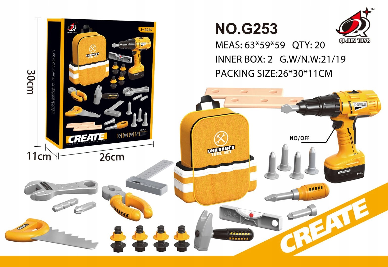 Богатый набор инструментов с рюкзаком и интерактивной дрелью-шуруповертом для детей от трех лет. Набор изготовлен из высококачественного пластика. Рюкзак для инструментов имеет основное отделение на молнии, небольшие карманы по бокам и строчку, в которую можно положить инструменты. Дрель/шуруповерт питается от 2 батареек типа АА 1,5 В (не входят в комплект), завинчивается и отвинчивается, а также имеет съемный аккумулятор, как у настоящей дрели, и сменные насадки. В наборе целых 27 элементов, кроме рюкзака и дрели/отвертки, в наличии также: молоток, плоскогубцы, ручная пила, угольник, разводной ключ, ватерпас, отвертка, шурупы, дюбеля и завинчивающиеся элементы.
