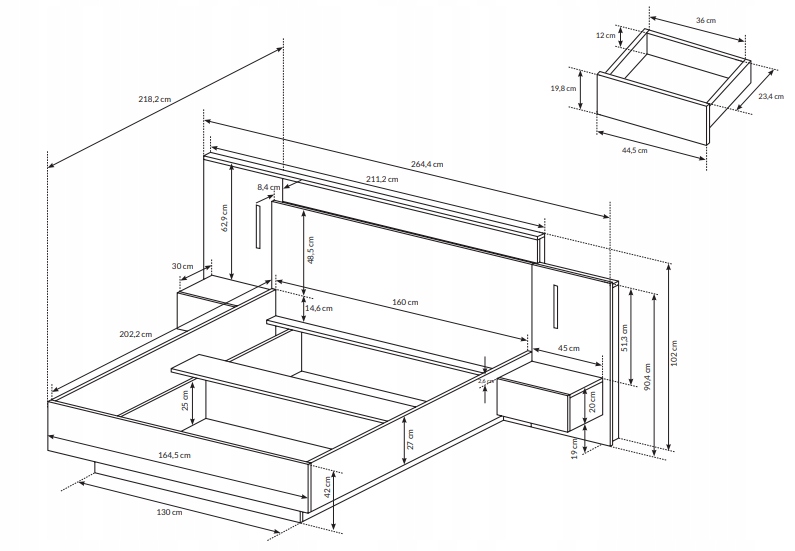 - КРОВАТЬ 160 + 2 НОЧНЫЕ СТОЛИКА СО СВЕТОДИОДНОЙ СВЕТОДИОДНОЙ СТОЛИКОЙ – ширина 264,4 см/высота 101,6 см/глубина 218,2 см.