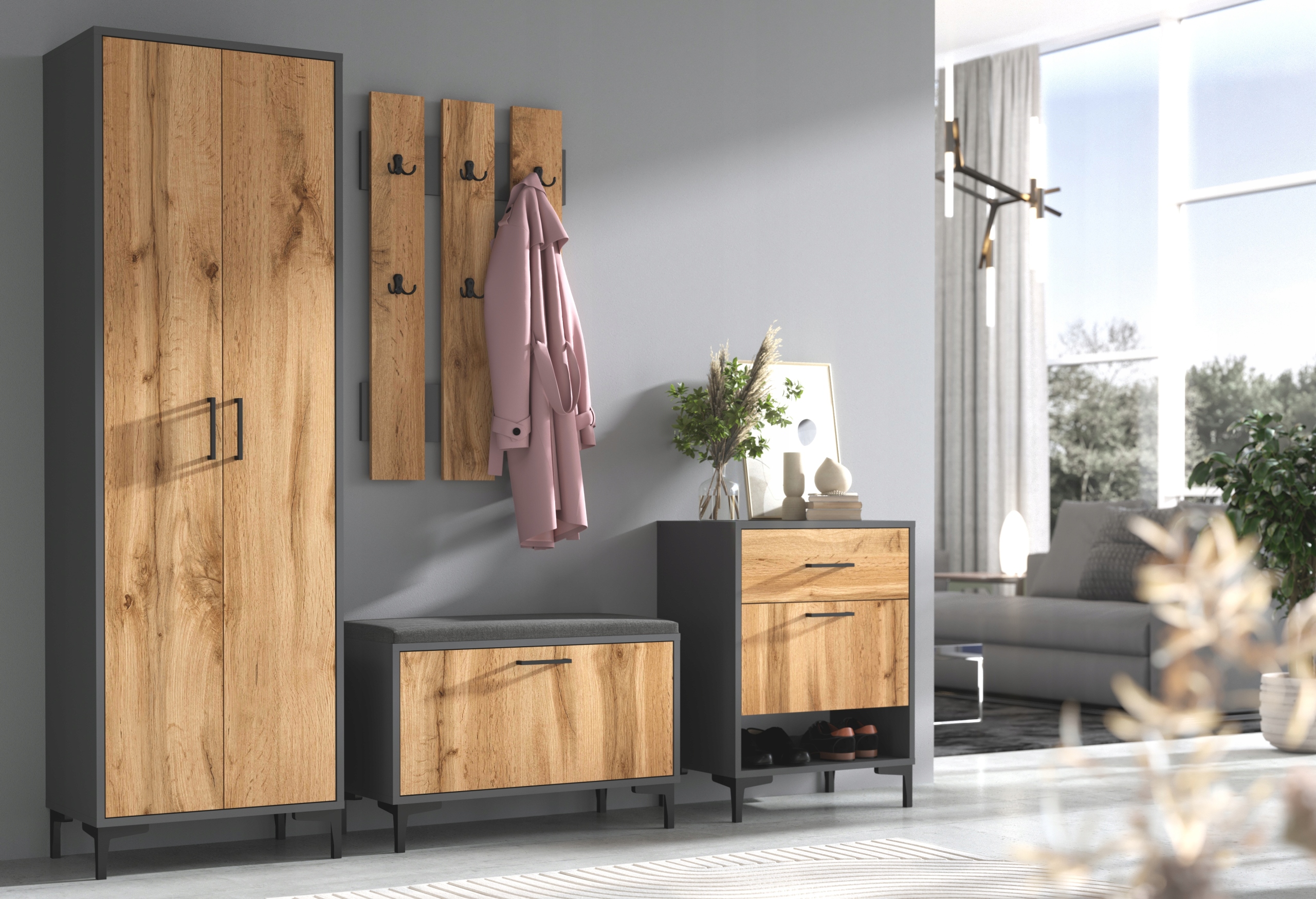 Это возможно благодаря большому шкафу с выдвижной штангой для одежды и большому шкафу с полками для хранения обуви. Настенный блок COMO также включает вешалку, которую можно легко разместить в любом месте стены. Все сделано из качественного ламината и прочной мебельной фурнитуры. Благодаря их использованию и вниманию к деталям была создана долговечная мебель.