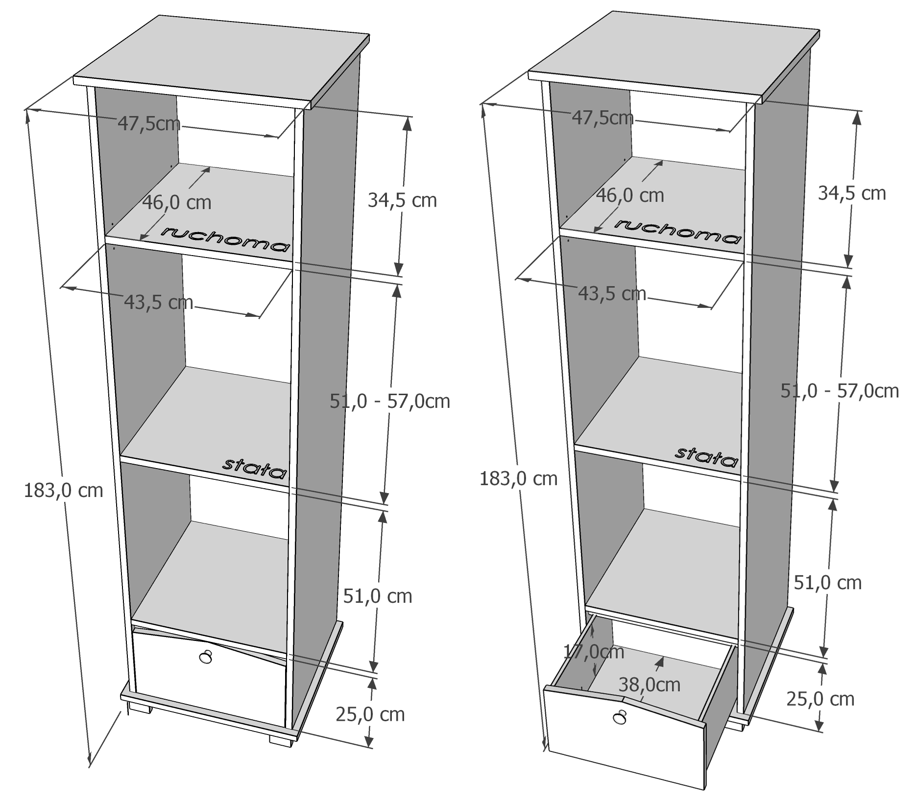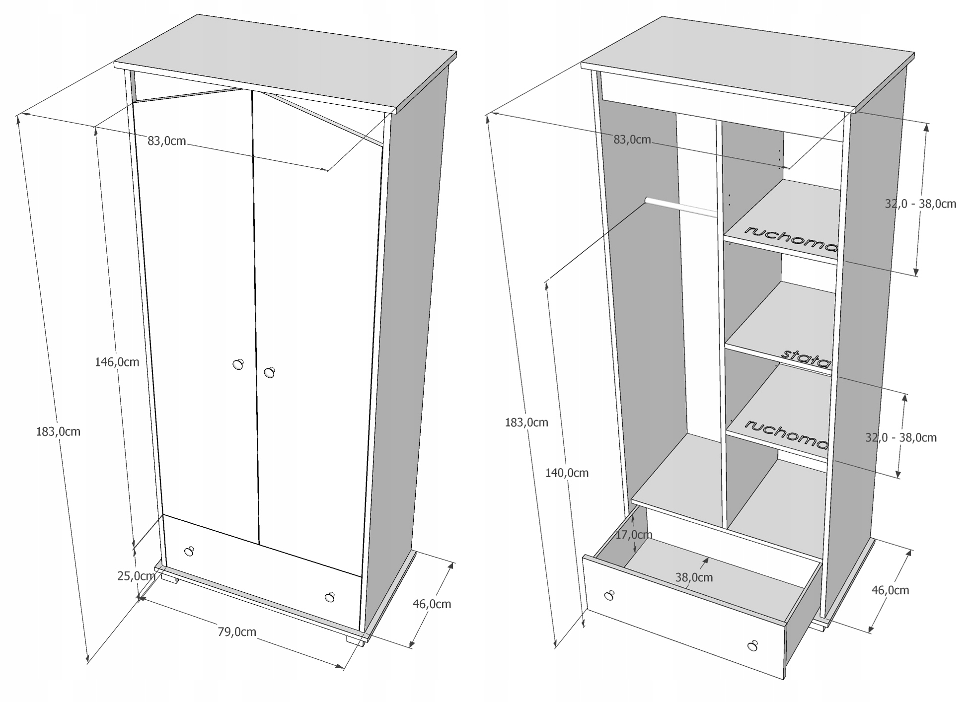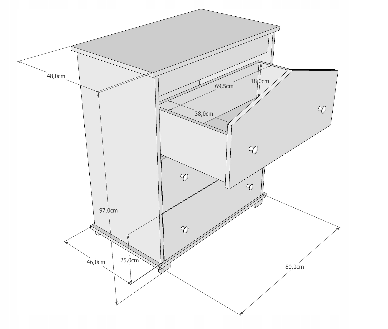 Мебель изготовлена из высококачественного мебельного щита (марка Е1) и сырья, соответствующего необходимым стандартам. Закругленные формы и качество материала обеспечивают несомненную безопасность при небольшом использовании. Мебель стоит на четырех ножках, что делает ее очень устойчивой. Ящики установлены на шариковых направляющих, что позволяет легко хранить детский гардероб.