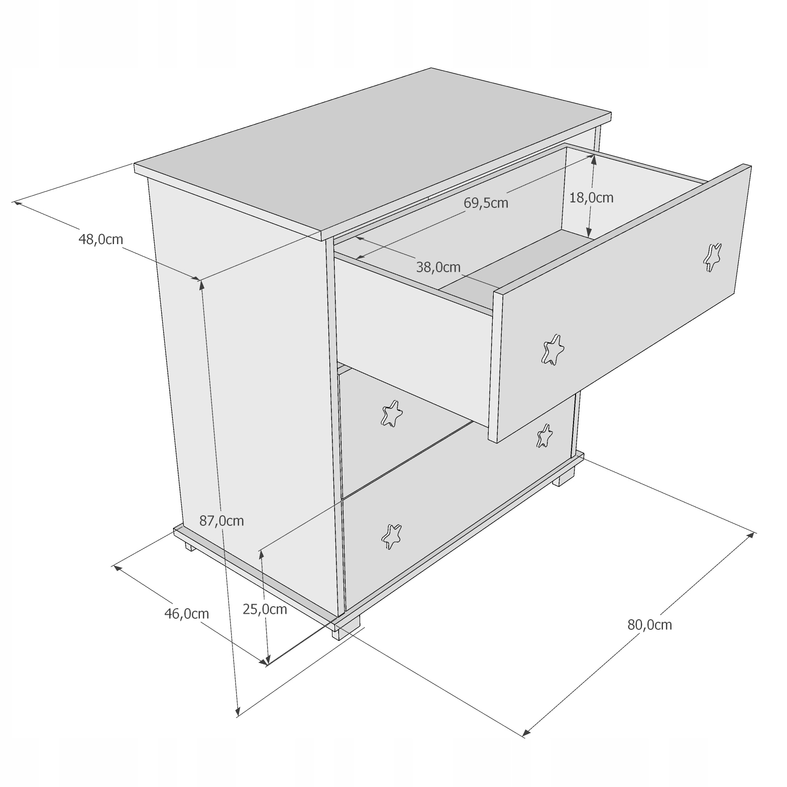 Мебель изготовлена из высококачественного мебельного щита (марка Е1) и сырья, соответствующего необходимым стандартам. Закругленные формы и качество материала обеспечивают несомненную безопасность при небольшом использовании. Мебель стоит на четырех ножках, что делает ее очень устойчивой. Ящики установлены на шариковых направляющих, что позволяет легко хранить детский гардероб.