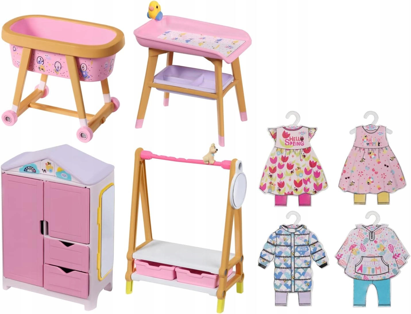 - Шезлонги и шкаф для одежды: в комплект игровой мебели BABY Born Mini входит всем известный шкаф для одежды BABY Born и штанга для одежды BABY Born The. В комплект также входят 4 декоративных платья для вешалки для одежды.