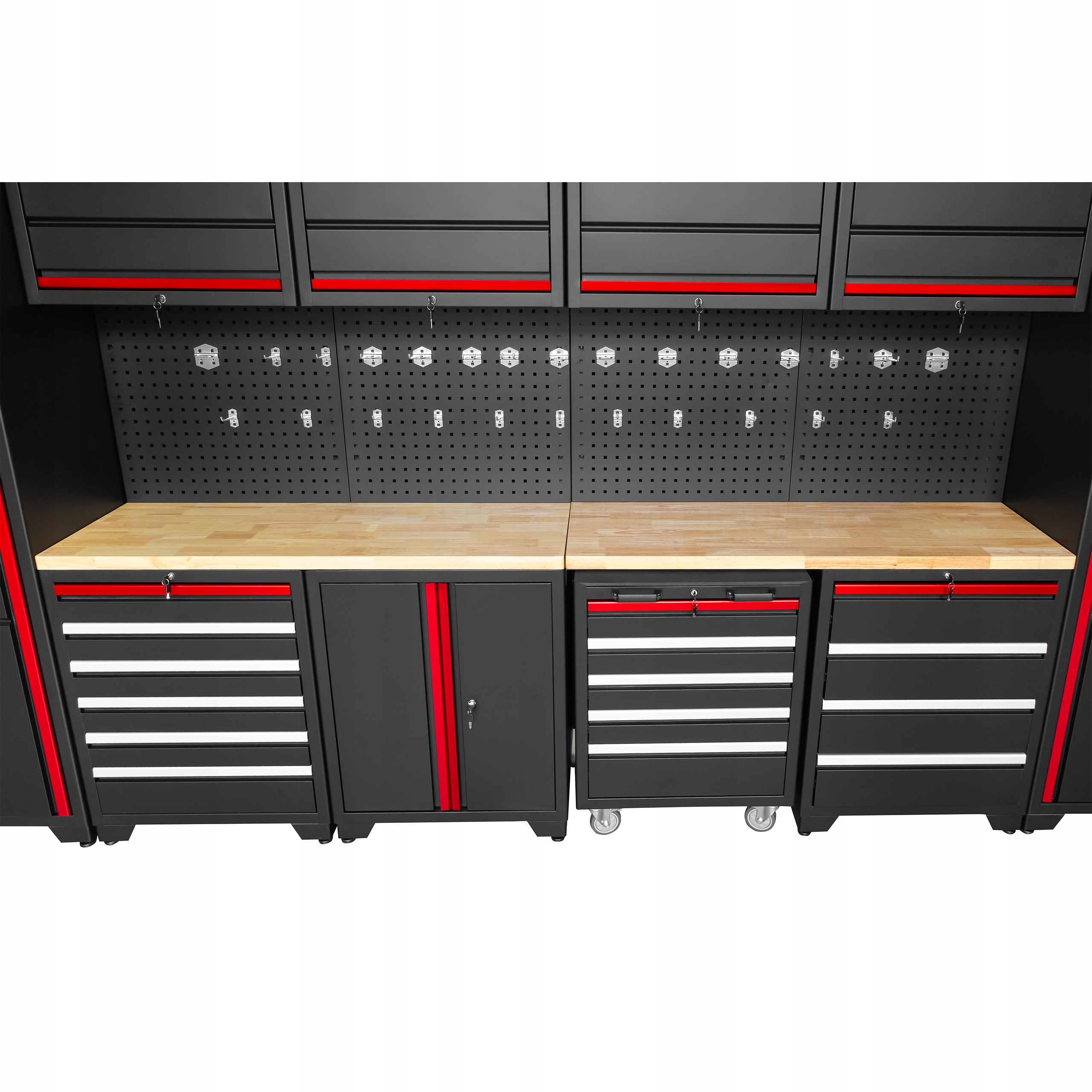 Исключительно прочная и функциональная система мебели для мастерских от Farys представляет собой сочетание прочной стали с порошковым покрытием и столешницы из натурального дерева толщиной 4 см. В комплект входят два высоких боковых шкафа, четыре верхних шкафа, перфорированная доска с 26 крючками разного типа и длины, просторная столешница, два подстольных шкафа с выдвижными ящиками и один с полками, а также передвижная тележка для инструментов - все в элегантном черно-красном стиле.