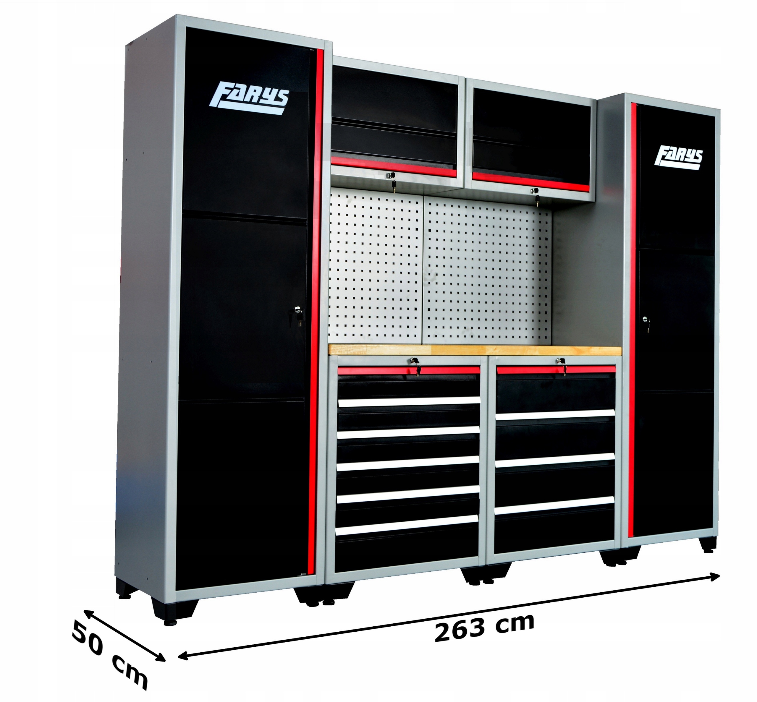 - стоящие шкафы имеют ящики: с левых 6 ящиков (5x с высотой 7 см и 1 ниже высоты 11 см) и от правых 4 ящиков с высотой 13 см