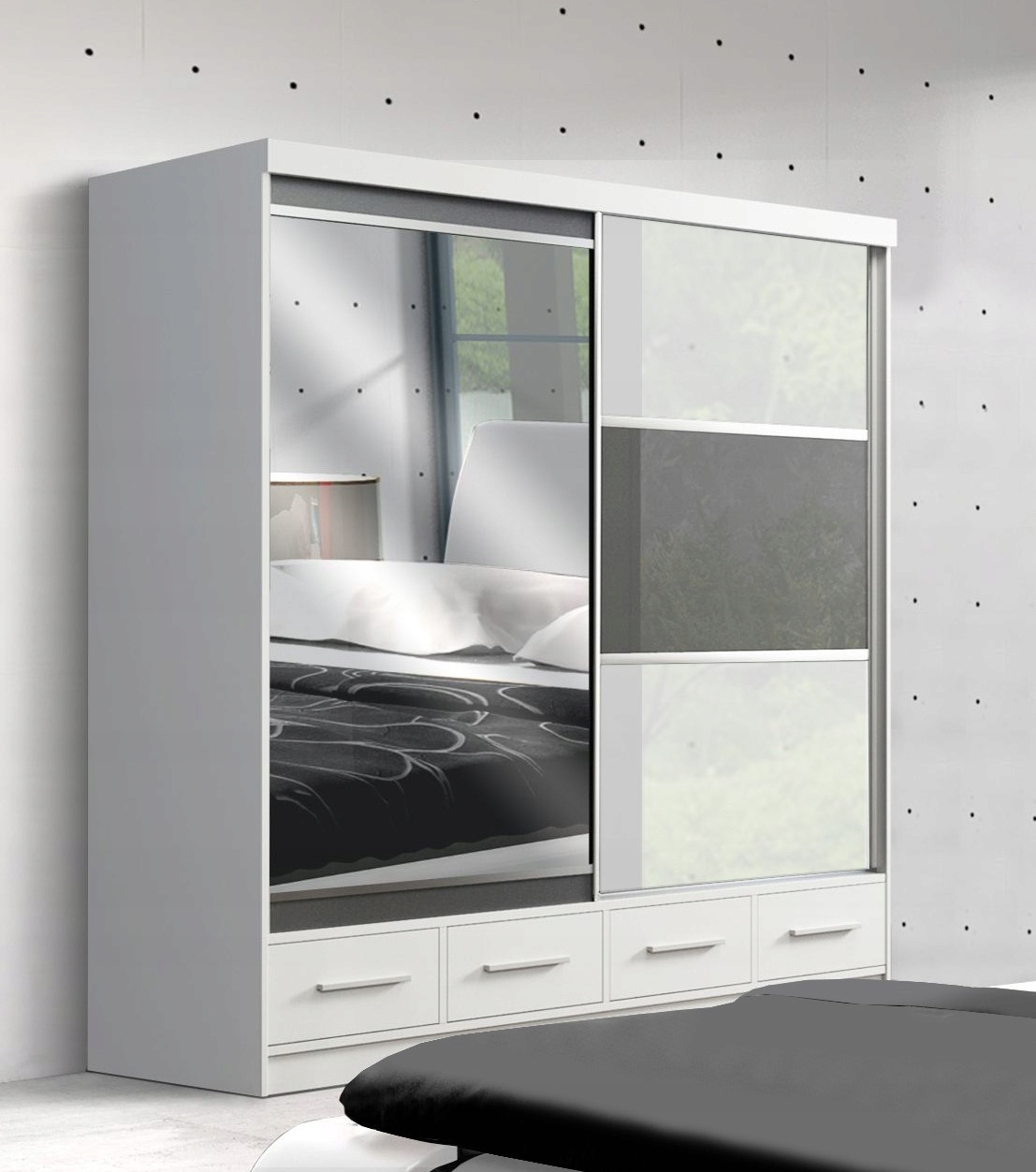 ⭐ ГАРДЕРОБ - Двухдверный шкаф-купе с роликовой системой высочайшего качества. Корпус шкафа белый, фасады из белого стекла Lacobel вверху и внизу шкафа, посередине на одной двери использовано серое стекло Lacobel, а на другой двери использовано зеркало. Гардероб из последней коллекции удовлетворит ожидания даже самых требовательных покупателей. Он очень вместительный, что поможет поддерживать порядок в комнате и сэкономить место при хранении другой мебели.