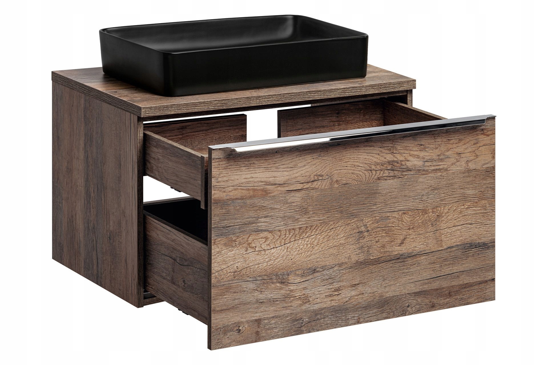 - Шкаф со столешницей с боковыми ручками и четырьмя ящиками + черный умывальник