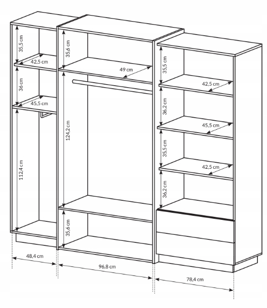 Шкаф оснащен зеркалом на внутренней передней части и практичными ящиками. В левой стороне гардероба расположена ниша с полкой и штангой для одежды, посередине просторная ниша с штангой для подвешивания одежды и по одной полке вверху и внизу. В правой части гардероба имеется просторная ниша, оборудованная 4 полками, а в самом низу - два вместительных ящика.