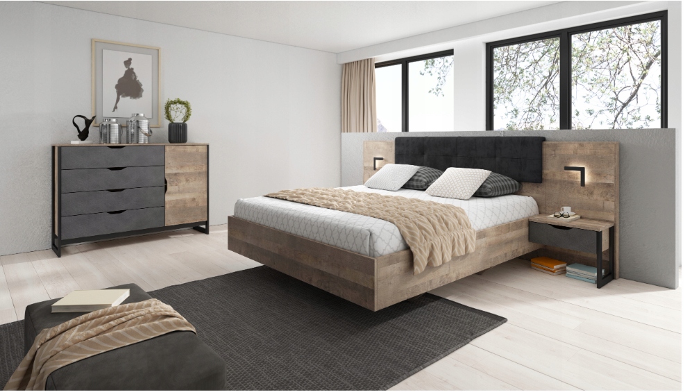 кровати Спящая область 160x200 и имеет дровяную раму. Мало того, что вы можете провести вечер с приятным светом, но и принести капризную атмосферу в спальню, подчеркивая уникальный стиль лофта интерьера. Оснащен зеркалом , Практические ящики . слева страница Гардероба содержит перерыв с палкой для подвески одежды. Светодиодное освещение доступно на наших других аукционах