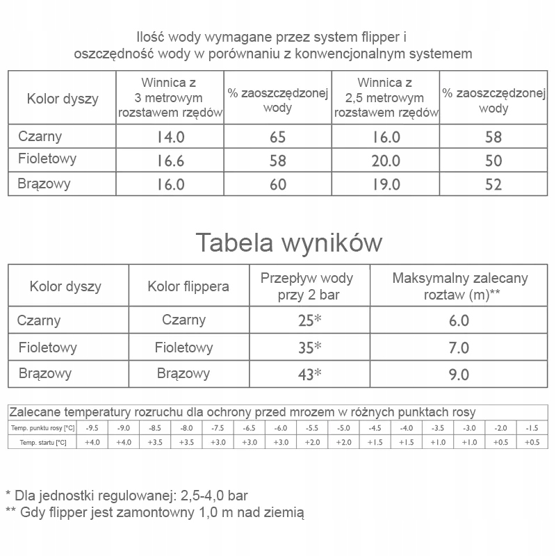 Микроразбрызгиватель противоморозный FLIPPER предназначен для защиты виноградных лоз от мороза. Это обеспечивает точный полив узких и длинных рядов, оставляя при этом междурядья сухими. Этот тип разбрызгивателятакже можно использовать для других пропашных культур, таких как черника, смородина, малина и т. д.. Экономия воды по сравнению с традиционными полноповоротными разбрызгивателями также делает его эффективным решением для защиты садов от замерзания.