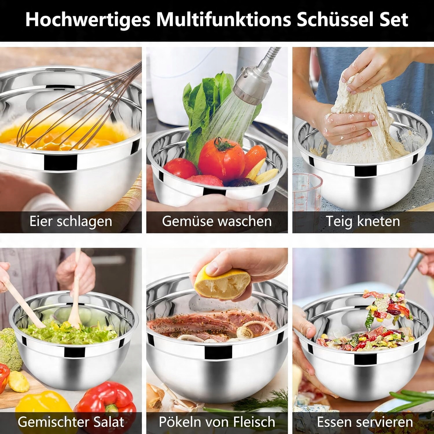 Набор из 3 чаш для смешивания изготовлен из высококачественной нержавеющей стали, что обеспечивает прочность и долговечность. Не беспокойтесь о вмятинах, ржавчине или износе — они идеально подходят для повседневного использования на кухне.
