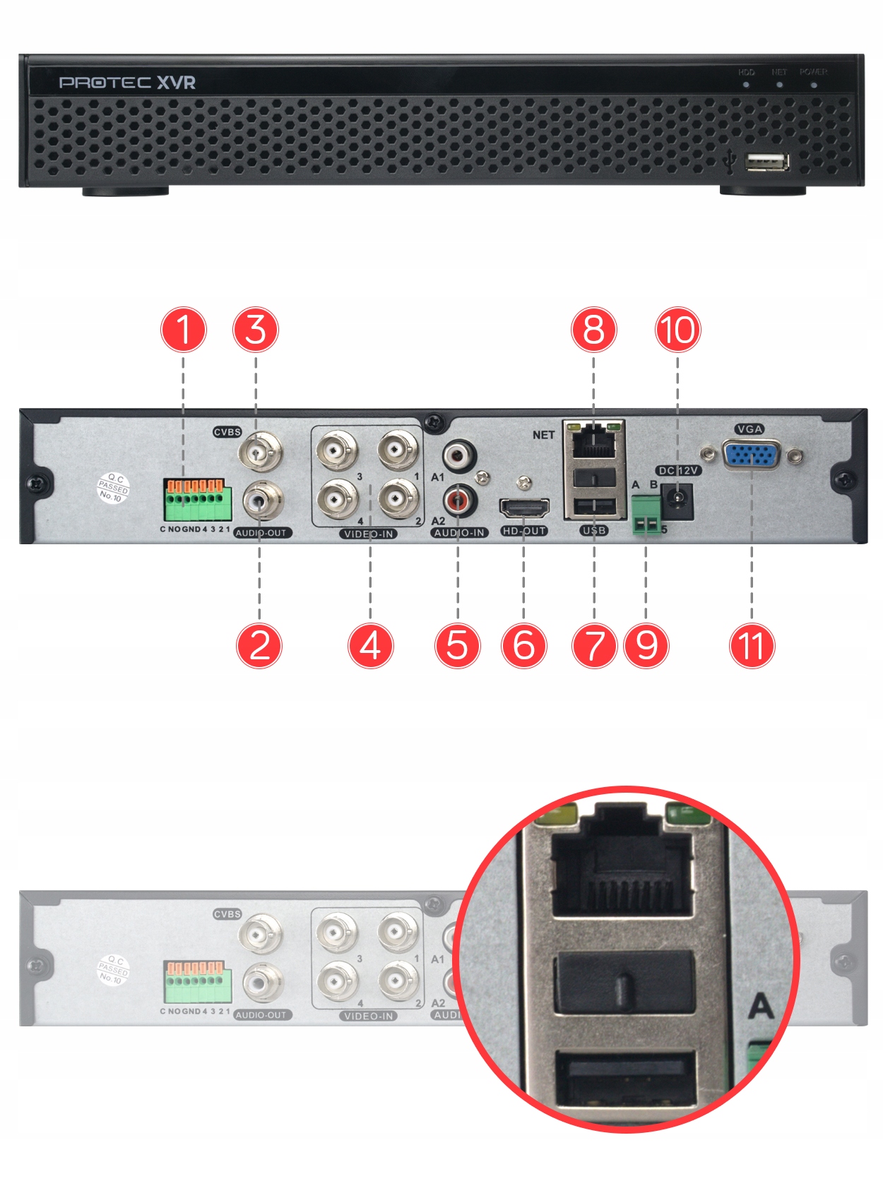 USB-разъемы позволяют удобно подключать мышь для управления рекордером (USB-мышь в комплекте), а также одновременно подключать портативное запоминающее устройство для загрузки записей с камер.