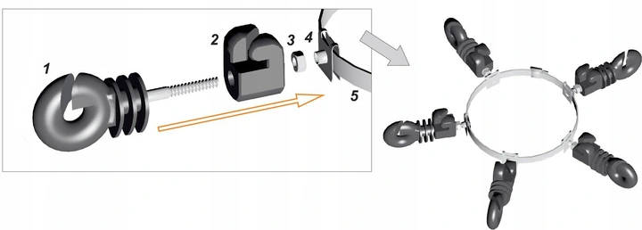 Установку защитного желоба для куниц следует начинать с размещения зажимов (5) на водосточных трубах вместе с монтажными заглушками для M6 изолятор (4), гайки (3), изоляторы G264 (2) и изоляторы с метрической резьбой М6 (1).