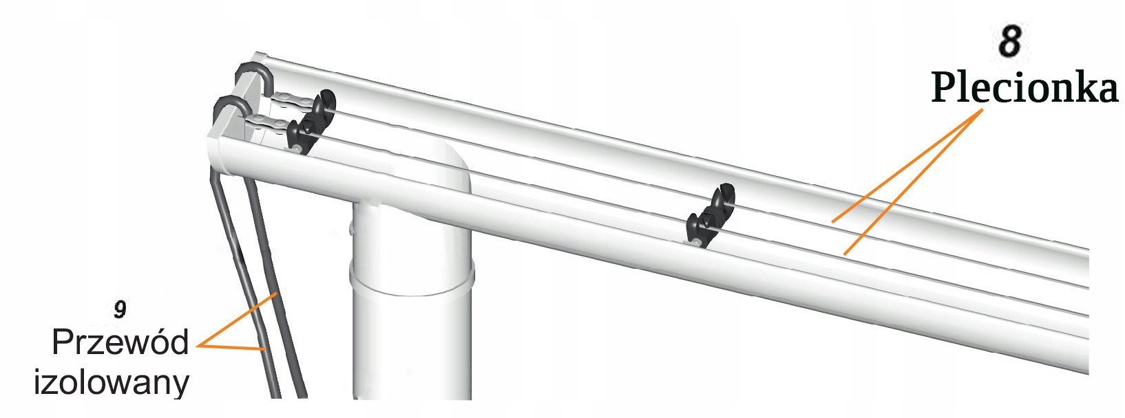 Проводим 2 высоковольтных кабеля от электрификатора (7) к зажимам с изоляторами . И протягиваем плетеную веревку через изоляторы.