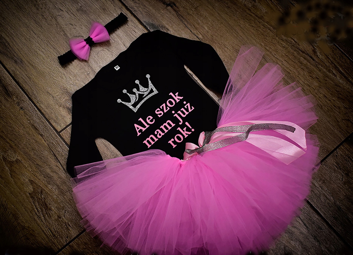 В комплект входят: боди 86 размера (с длинными или короткими рукавами на выбор) с надписью НО ШОК I МНЕ УЖЕ ГОД. Юбка-пачка из фатина, сшитая на заказ для девочки, и повязка на голову в цветах комплекта.