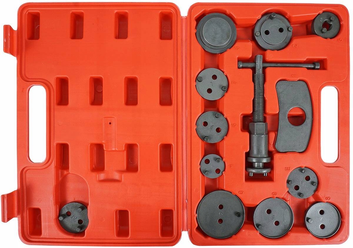 Профессиональный набор из 13 предметов для реверса/запрессовки тормозных поршней в цилиндры тормозной системы, необходимый при ремонте автомобилей. оснащен дисковыми тормозами. Ручка оснащена магнитным наконечником, благодаря которому удерживает на оси пластину, соответствующую данному поршню. Набор предназначен для каждой автомастерской, где он помогает ускорить обслуживание тормозных систем. Набор подходит для большинства автомобилей на рынке: Audi, Fiat, Ford, Isuzu, Honda, Jaguar, BMW, Mercedes Benz, Mitsubishi, Nissan, Toyota, Renault, Volvo, Citroen, Opel, SAAB, GM и VW.