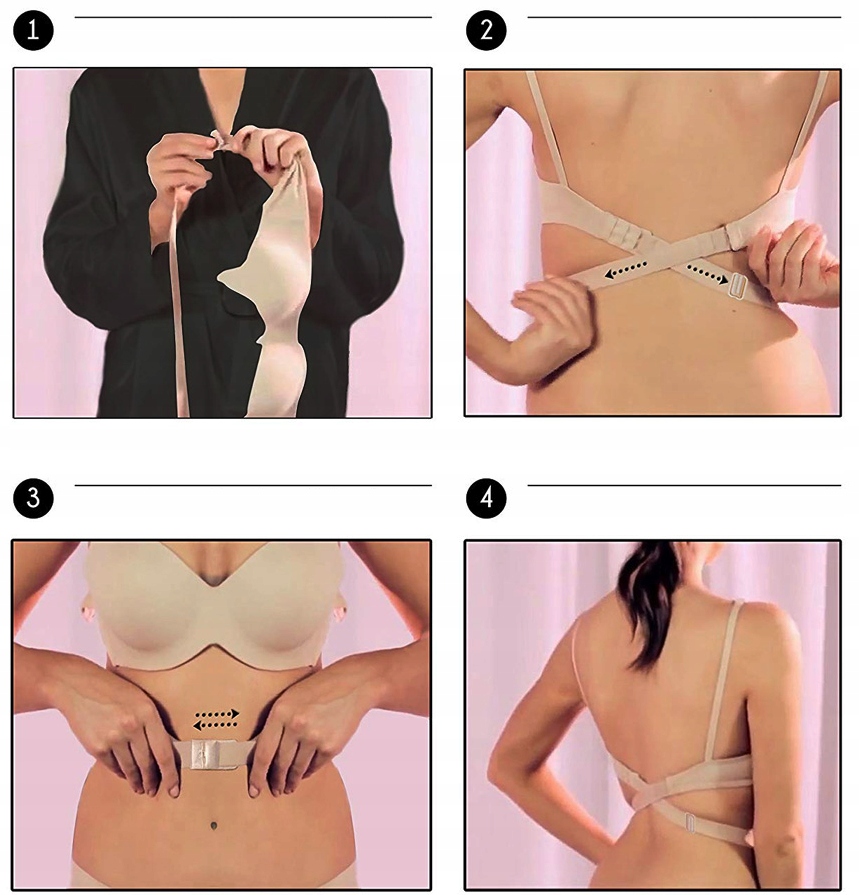 С помощью этого ремешка/крестика мы можем опустить застежку и пропустить ее через спину и живот так, чтобы крючки оказались почти вдвое ниже, чем в классических бюстгальтерах.