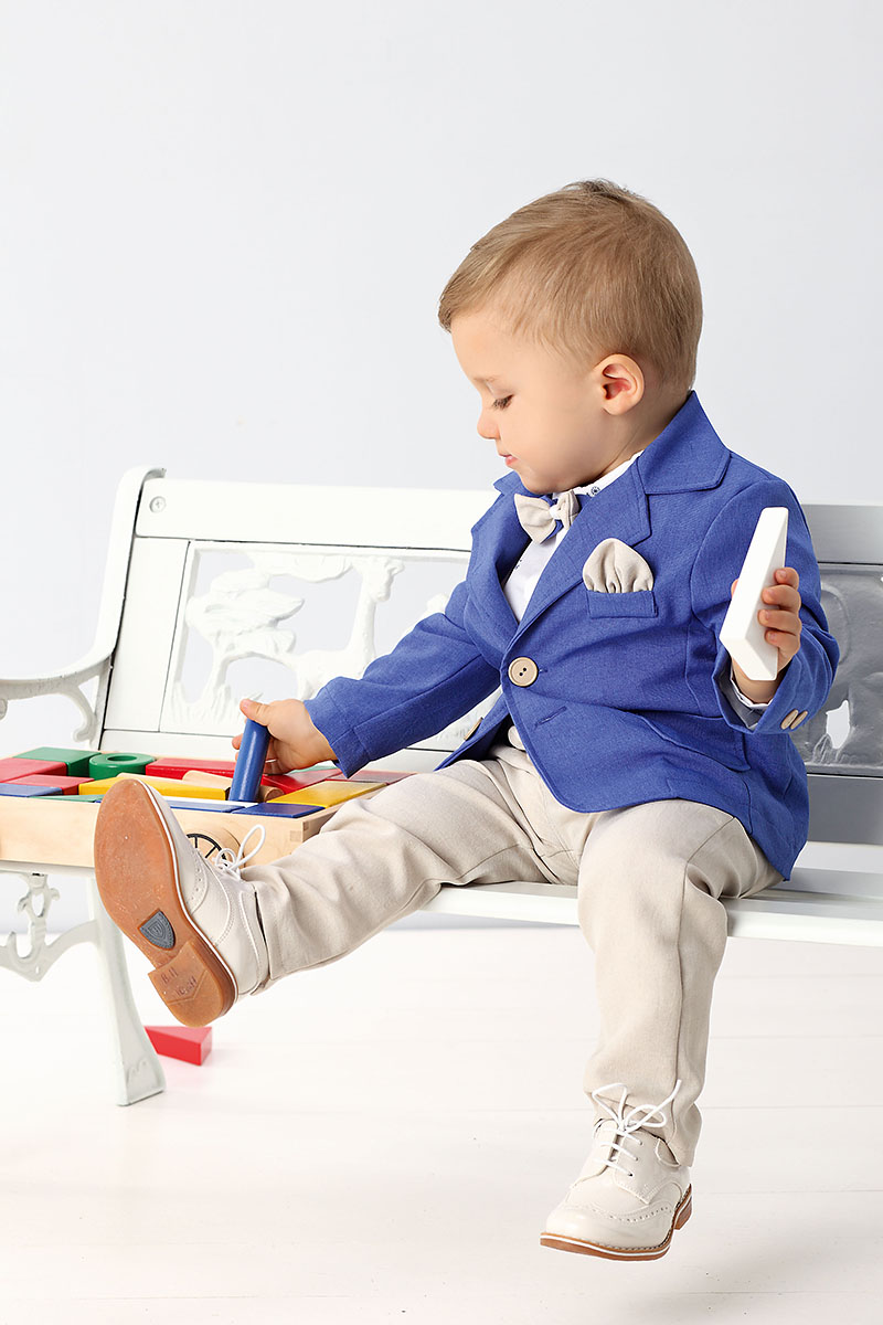 2. Бежевые брюки для мальчика на узкой брючине, изготовлены из ткани. В передней части талии имеются клапаны на пуговицах для регулировки обхвата талии, карманы застегиваются на пуговицу.