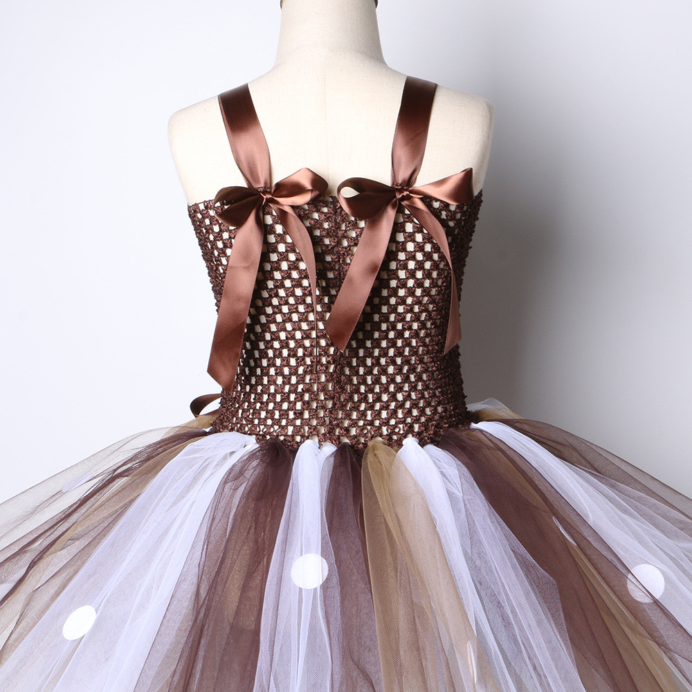 ✅ Платье: платье состоит из трех слоев тюля, благодаря чему оно расправляется и прекрасно сидит по фигуре. Тюль нескольких оттенков коричневого цвета, украшенный снаружи белыми точками. Корсет из сетчатого эластичного материала, украшенный цветами. Бретели завязать бантиком самостоятельно.