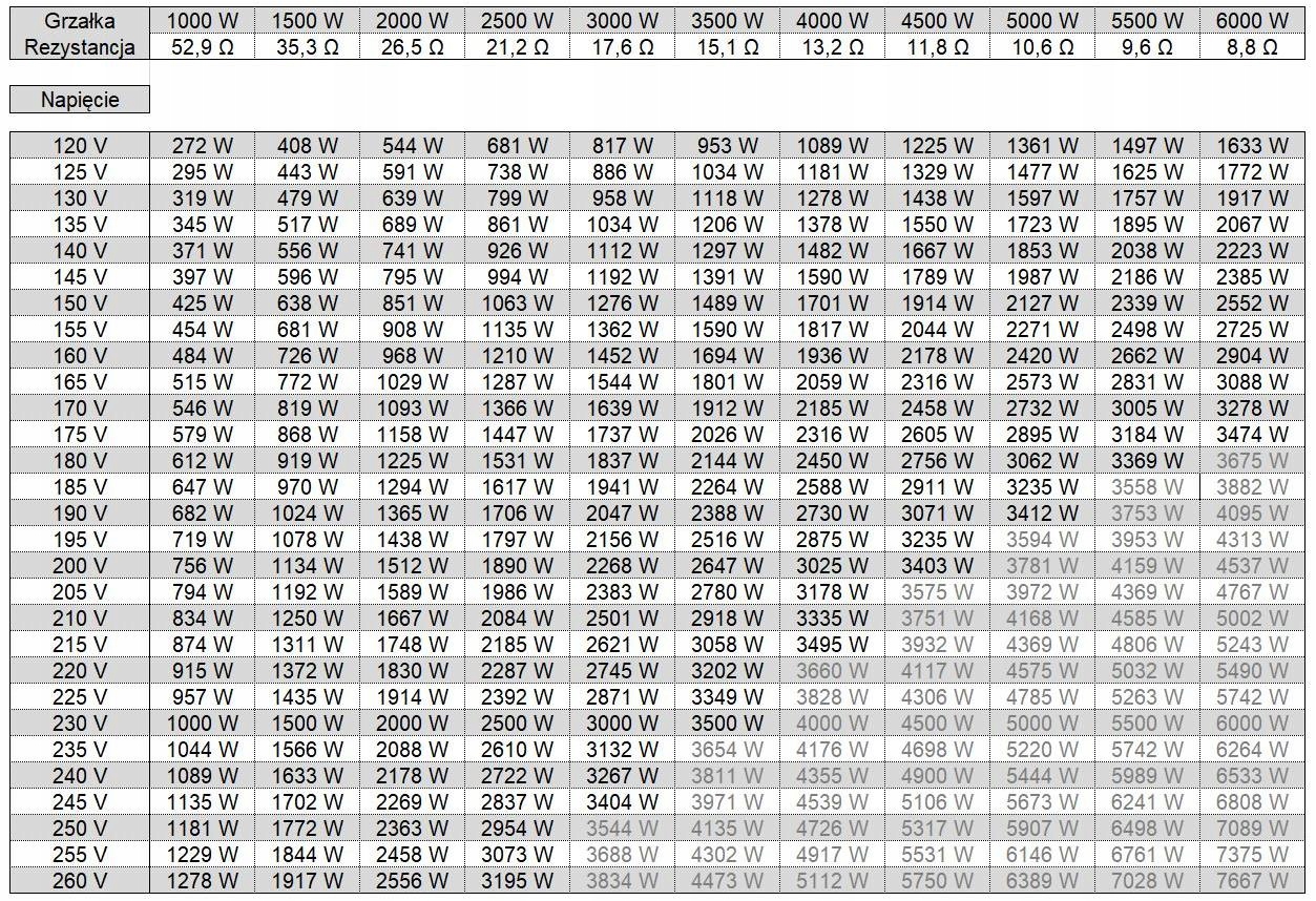 2. Знание рабочего напряжения (VMP) последовательной системы панелей (левый столбец) и знание того, какую питание мы хотим получить (таблица), мы обнаружим, какой нагреватель должен быть установлен (верхняя строка). Пример: напряжение панели (VMP) 200V и ожидаемая мощность 3000 Вт - нагреватель 4000 Вт должен быть установлен