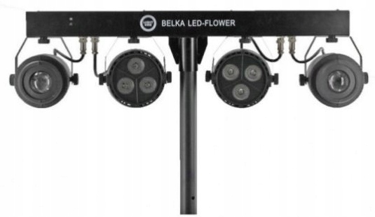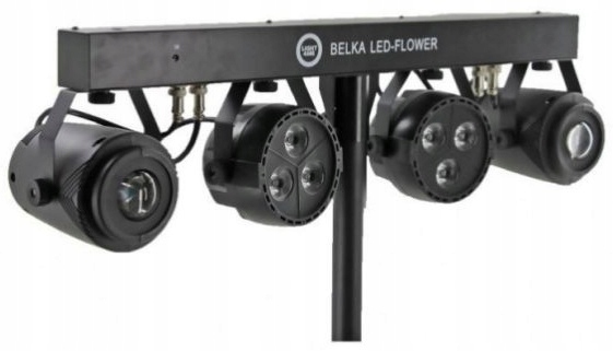 В комплект входит прочный штатив, монтажная планка, два многоцветных светодиодных прожектора PAR (12x1 Вт RGBW) и два светодиодных цветочных световых эффекта (1x10 Вт RGBW), постоянно подключенных к лучей, обеспечивая широкий угол освещения.
