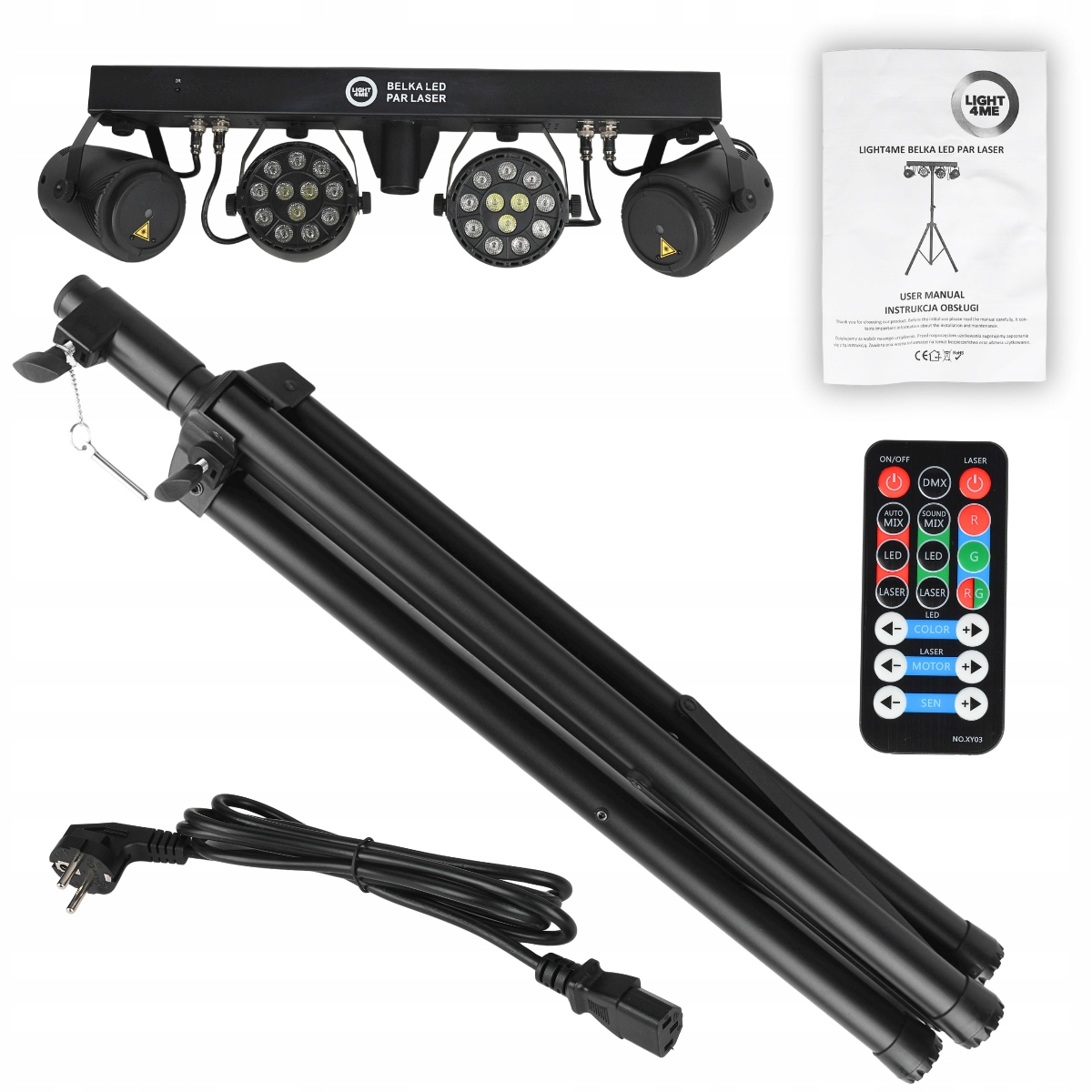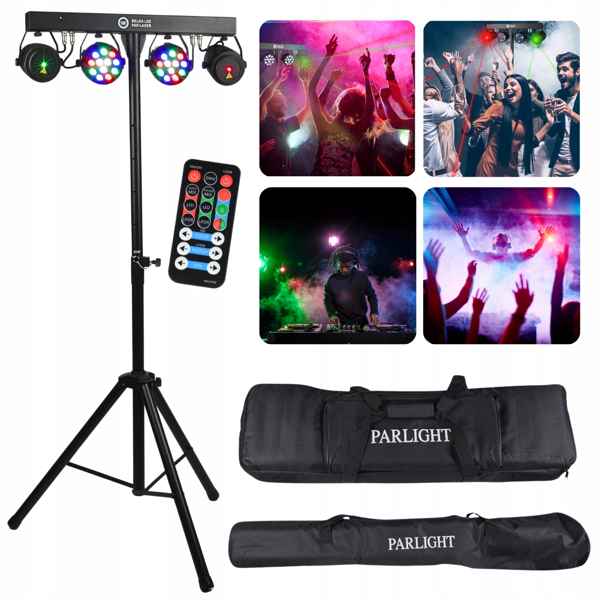 LIGHT4ME LED PAR LASER BEAM — это мобильный осветительный комплект в форме «Т» с возможностью беспроводного управления с помощью пульта, в состав которого входит поперечная полоса с двумя отражателями PAR и двумя лазеры, установленные на штативе. В комплект входят два прочных чехла из водонепроницаемой кодуры, позволяющих хранить и удобно транспортировать оборудование. Комплект отлично работает на небольших сценах, в танцевальных клубах и дискотеках, а также на свадьбах, празднованиях восемнадцатилетия и различных торжественных мероприятиях.