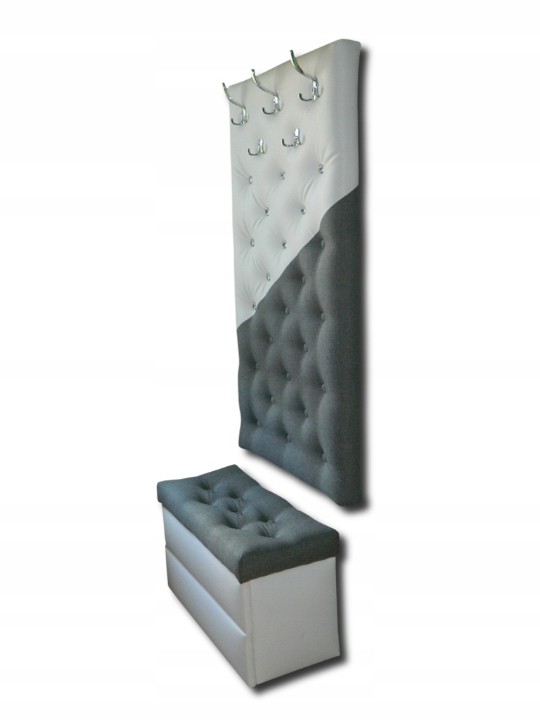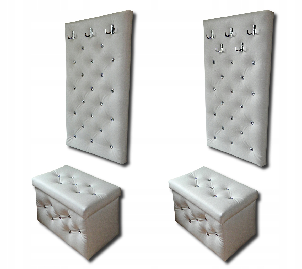 Эстетично и добротно выполненная мягкая панель с пятью вешалками размером 60/118см и пуфом/комодом 35/60см с кристаллами.