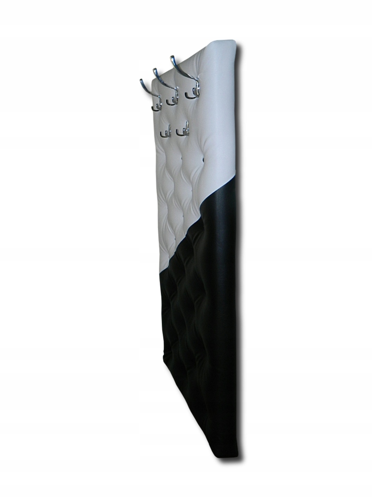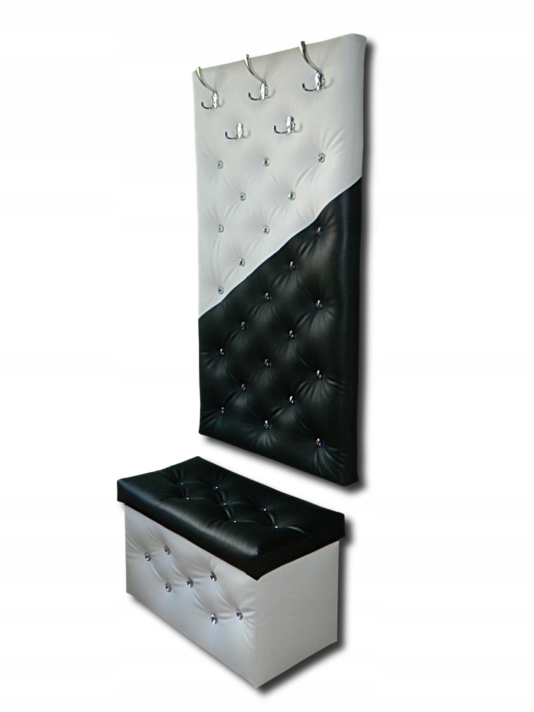 На аукционе представлена мягкая панель с пятью вешалками следующих размеров: высота 120 см, ширина 60 см, глубина 10 см, а также открывающийся пуф/коробка шириной 60 см, глубиной 30 см, высота 40см.