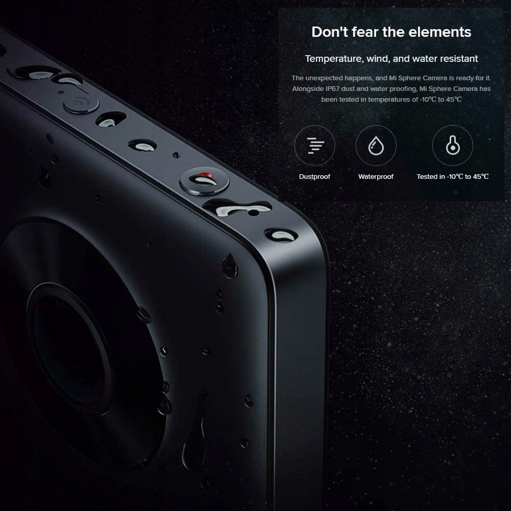 Из-за узкого поля зрения большинство спортивных камер имеют «слепые зоны». У MiJia 360° их нет. Камера имеет тонкий и прочный корпус с двумя противоположно направленными линзами типа «рыбий глаз», которые позволяют записывать видео в превосходном разрешении 3,5К (3200×1800 пикселей) на 360 градусов, без «слепых зон».