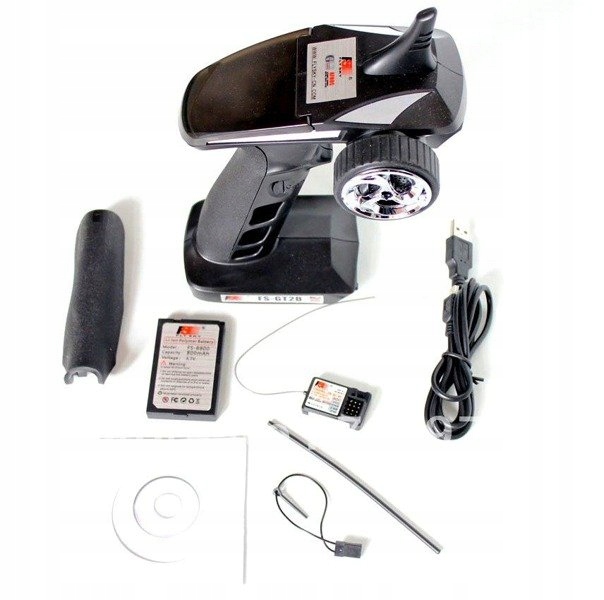 В комплект входят передатчик FS-GT2B и FS-GR3E приемник >, аккумулятор для питания передатчика, кабели и запасная ручка для держателя.