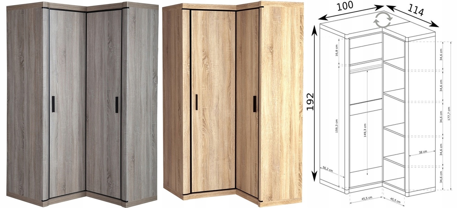 - шкаф угловой 21: 100 х 114 х 192 см, шкаф крепится справа или слева