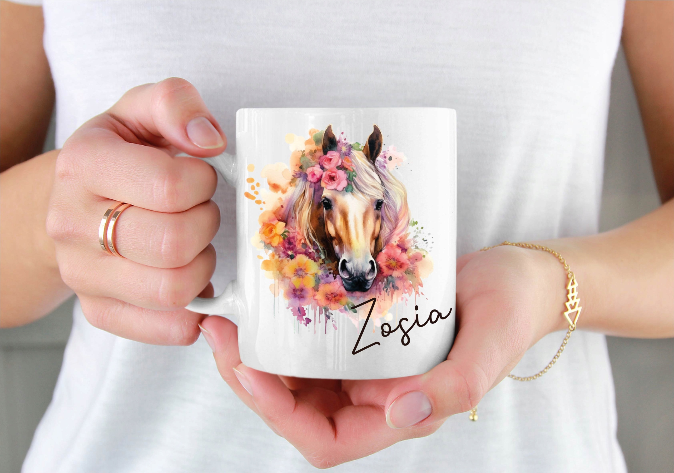 НАБОР ИЗ 3 ТОВАРОВ: подушка+кружка+сумка с цветами ЛОШАДЬ в стиле бохо+любое имя