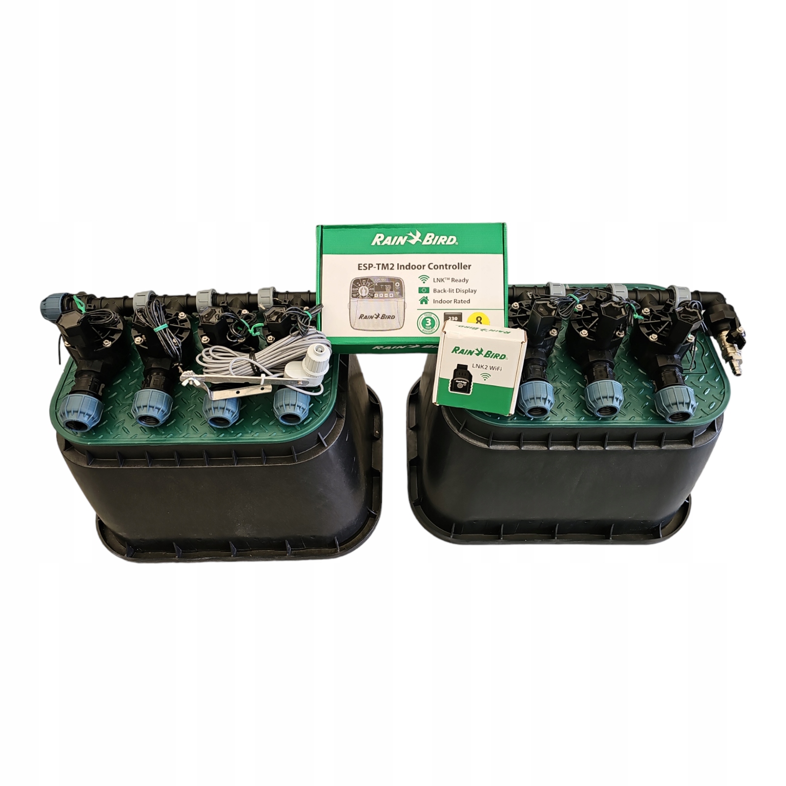 Готовый 7-секционный комплект для орошения Rain Bird с 8-секционным внутренним контроллером Rain Bird ESP-TM2 I8, WiFi-модулем Rain Bird LNK2, датчиком дождя Rain Bird RSD-BEX и 2 колодцами Rainworks Standard. h2 >