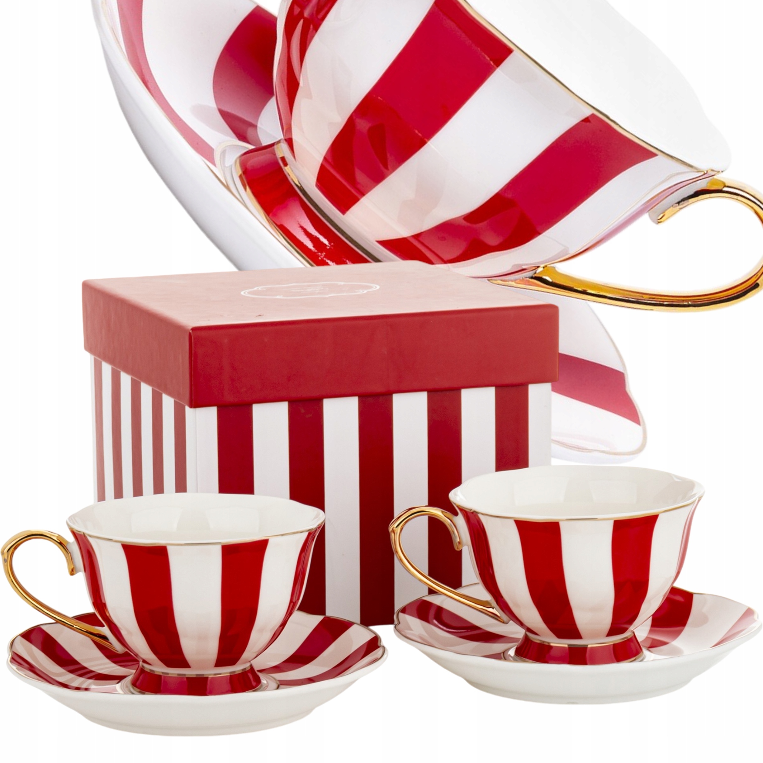 - Оригинальный, фарфоровый набор с красными и белыми полосами, украшенный нежным золотым орнаментом