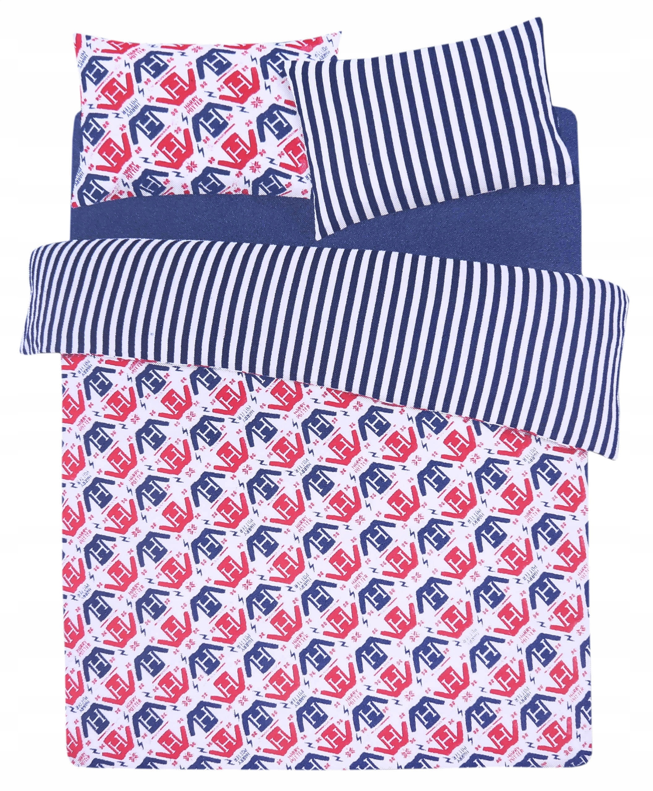 Двусторонний комплект постельного белья красного, синего и белого цветов с повторяющимся мотивом Гарри Поттера.